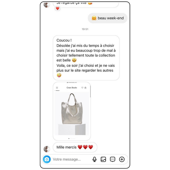 "I am an unconditional fan of your products! I have around thirty of them. The models are very well thought out: some are practical, others more elegant... The materials and colors are very varied, so that you can find bags and accessories to accompany us throughout the day, but also throughout the year!"