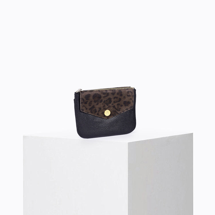We love its compact size and smart design, with a body in black grained cowhide leather, and the brown Léo leather flaps match all styles.