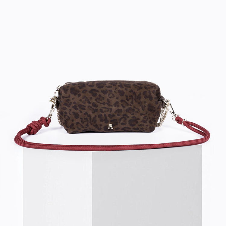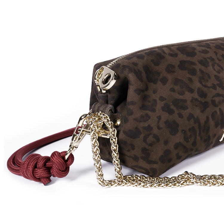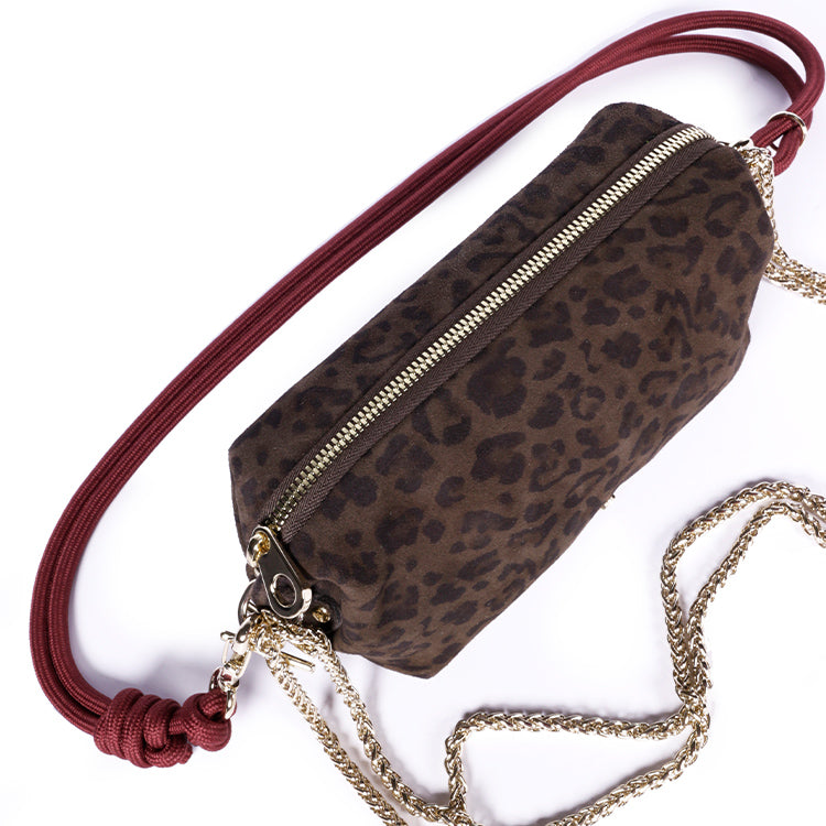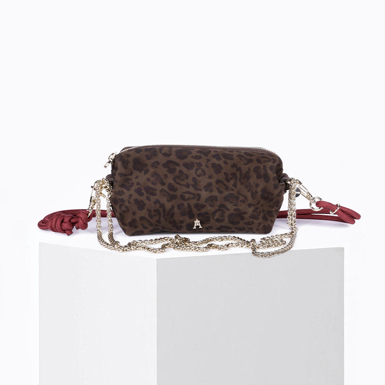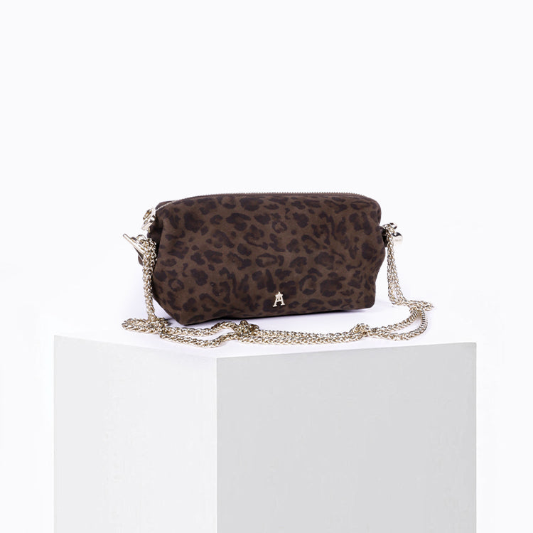 Crafted from brown suede goatskin with a leopard print and a protected surface, this pouch combines character and elegance. Its soft, lightweight texture, lined with organic cotton, makes it an accessory that's as practical as it is chic.