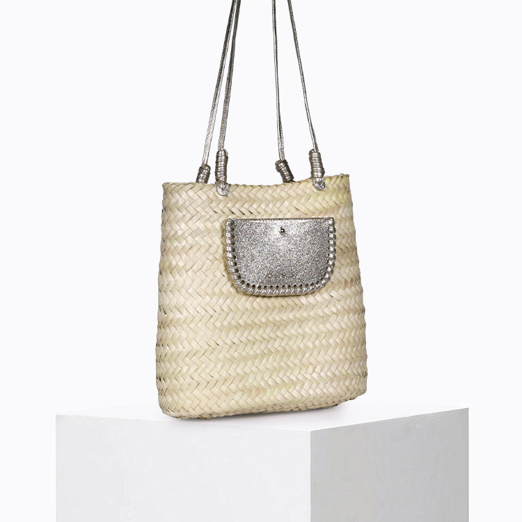 Il associe avec élégance le doum naturel et le cuir d'ageneau or clair, pour un panier à la fois graphique, léger et résolument moderne.