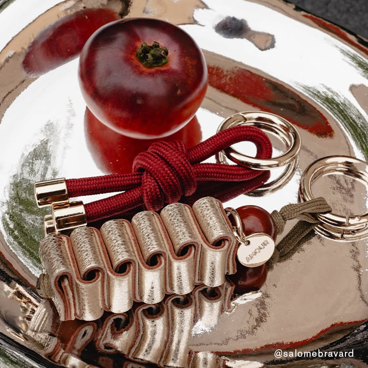 Original and playful, the Accordion key ring is made from strips of colored leather folded into a Khaki green and metallic bronze Mambo volume.