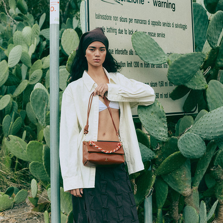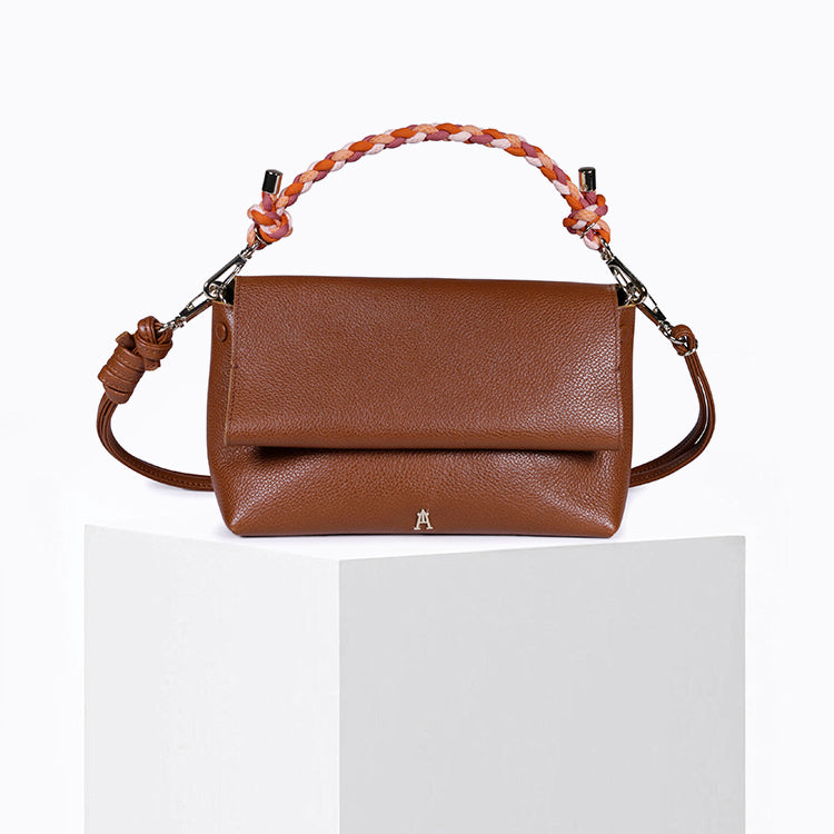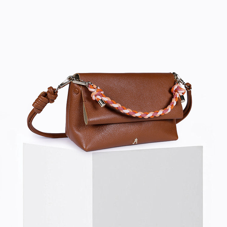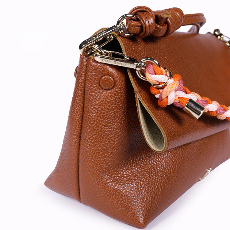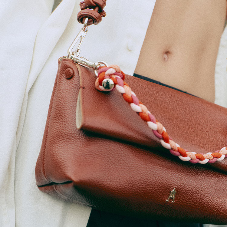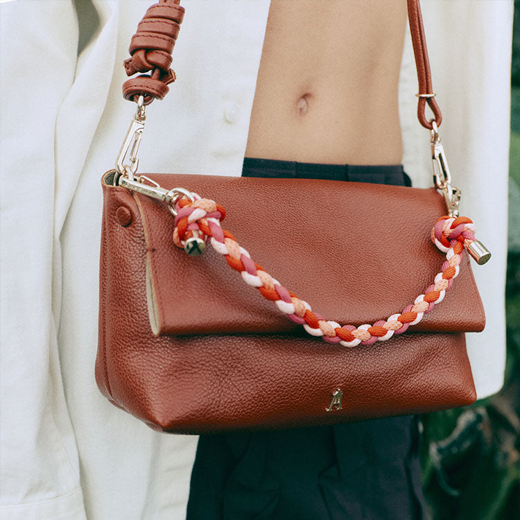 Pensé pour varier les styles, le sac Amie se porte aussi bien à l’épaule ou en crossbody grâce à sa bandoulière en cuir réglable, qu’à la main grâce à sa poignée courte fantaisie, réalisée en tressage de quatre cordons d’escalade aux nuances rose-orange, pour une touche décalée et contemporaine.