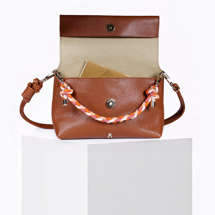 Réalisé en cuir de veau grainé camel, il offre une texture agréable et une excellente résistance à l’usage. À l’intérieur, la doublure en microfibre apporte douceur et légèreté. Les détails soignés font toute la différence : un rabat retourné qui dissimule l’aimant pour une ligne épurée, et des attaches de bandoulière ornées de rivets habillés de cuir, pour une finition raffinée.