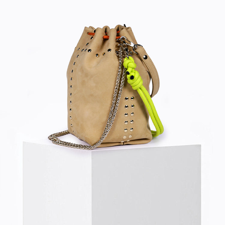 The Beco Sand revisits the iconic bucket format of the Bibi in a version made of sand-colored nubuck calfskin leather.
