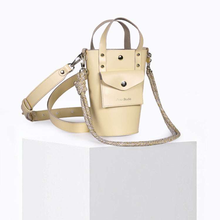 Crafted from thick, durable, butter-yellow cowhide leather , this small bucket bag is the perfect complement to your everyday looks. With its micro size , the Nono reinvents the iconic bucket bag in a modern version, combining elegance, lightness, and comfort.