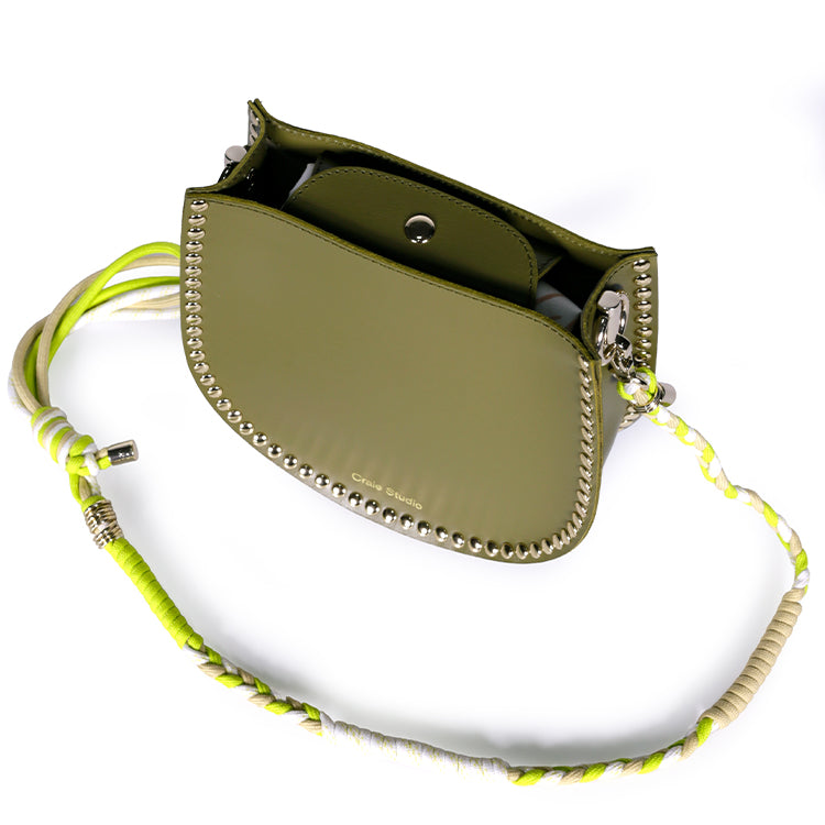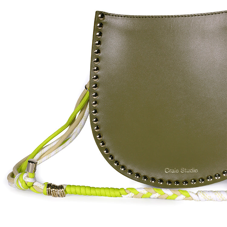 Crafted from rigid khaki calfskin leather , this bag impresses with its clean lines and timeless design. It features a unique climbing rope shoulder strap , combining braiding and embellishments, adjustable on the side with a sliding knot. It can be worn over the shoulder or crossbody , depending on your preference.
