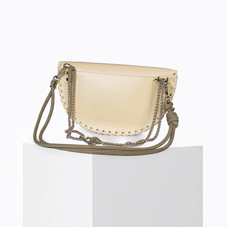 The Smile Stitch Vanilla banana bag is a bold and timeless version of our iconic belt bag . Made from thick and durable butter-yellow cowhide leather , it is enhanced by hand-stitched details with a leather cord that elegantly accentuate its curves and give it a strong character .