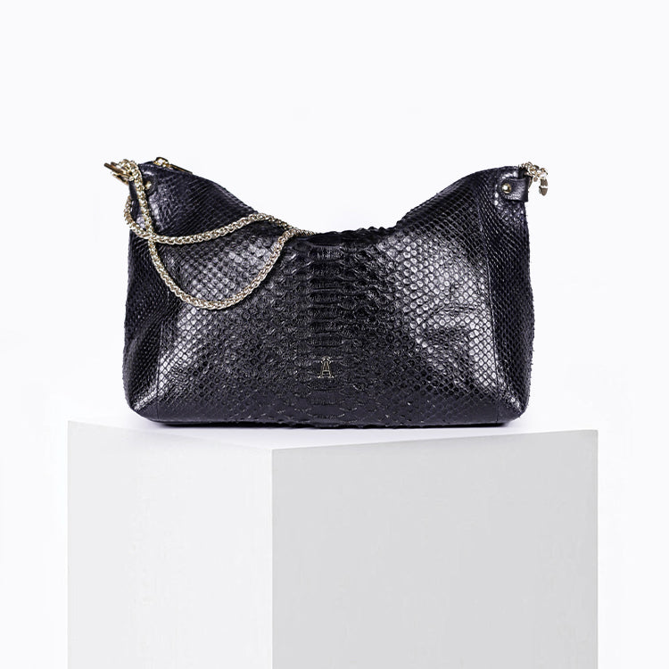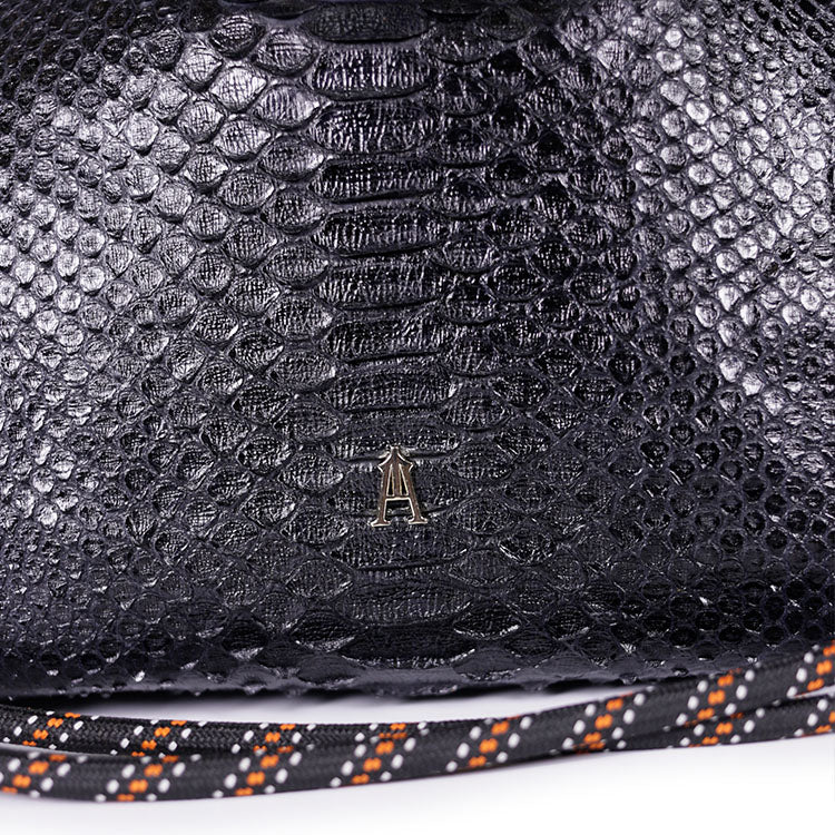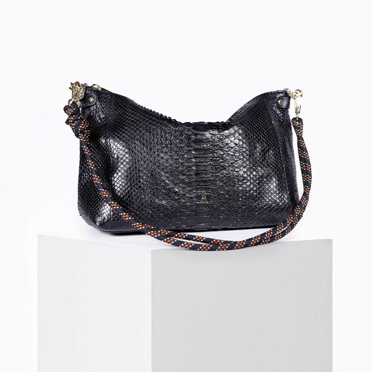This mallow is made from genuine black python leather. Responsibly farmed in Vietnam and tanned in Italy, this leather is CITES-certified, guaranteeing sustainable and ethical management.