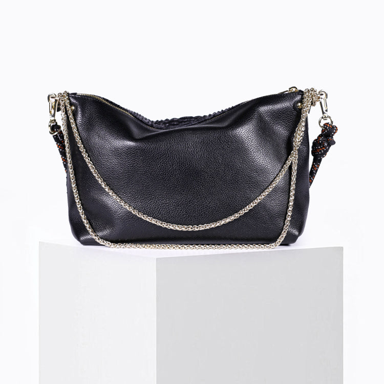 We love its versatile design; it comes with a thin gold chain shoulder strap for a more feminine look and a climbing rope shoulder strap for a modern, bold look. You can also wear it under your arm as an ultra-soft, oversized clutch for a more dressy look.
