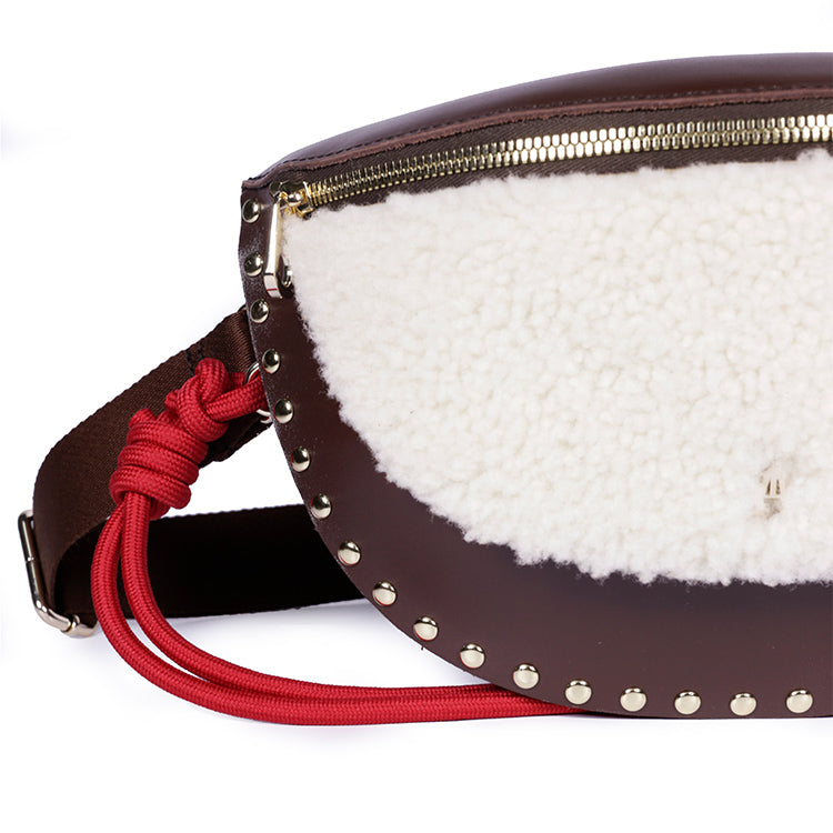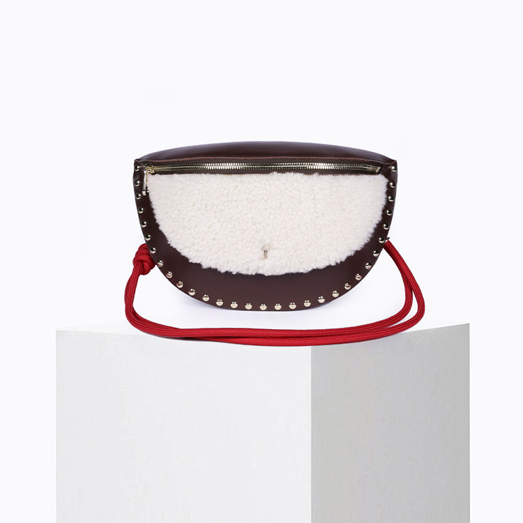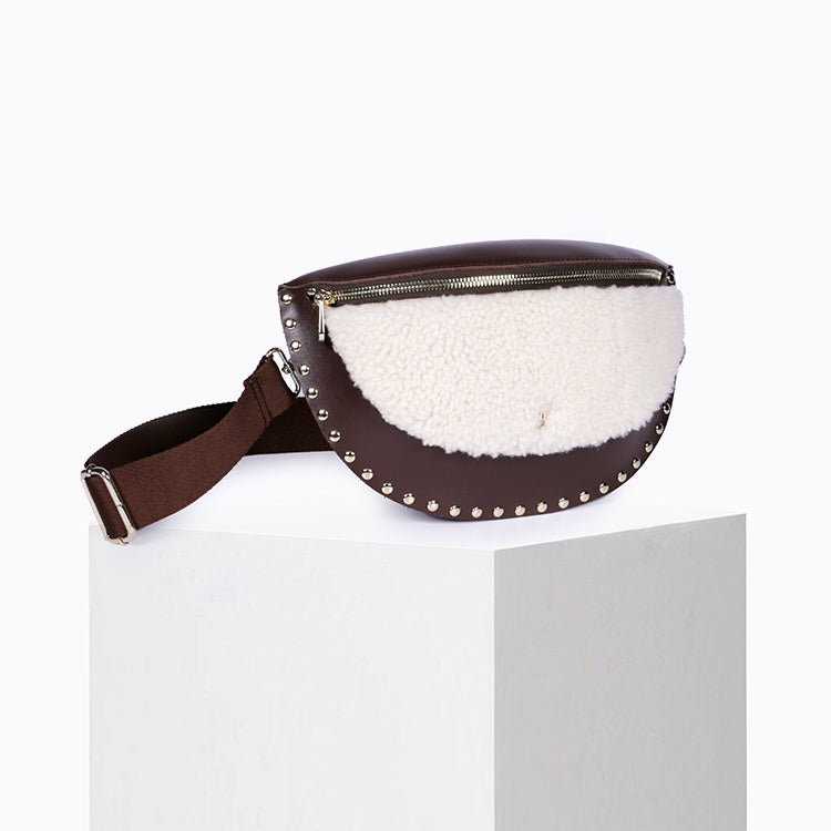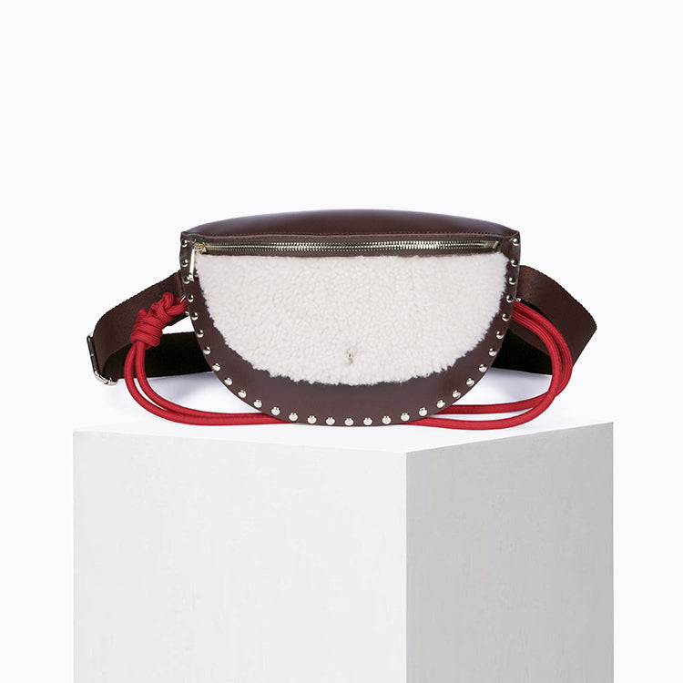The Smile Clou Laine Choco bum bag is the cozy and bold version of our iconic model. Made from chocolate cowhide, it is enhanced by a white sheepskin flap, contrasted with studs that give it a warm yet bold feel.