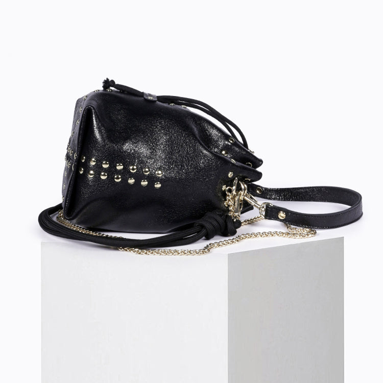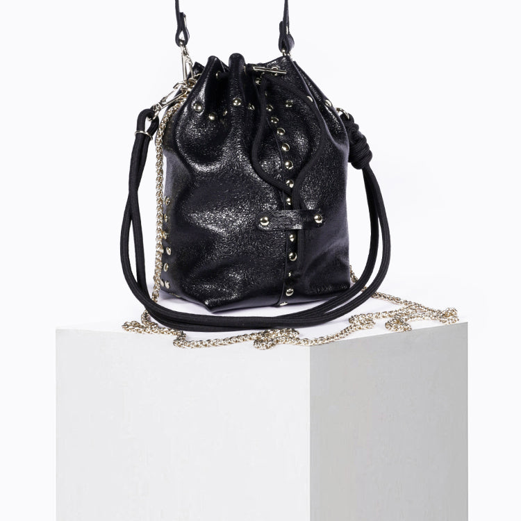 Le volume du sac se construit sans couture machine, uniquement grâce a un jeux de rivets dorés qui le donne une allure rock.