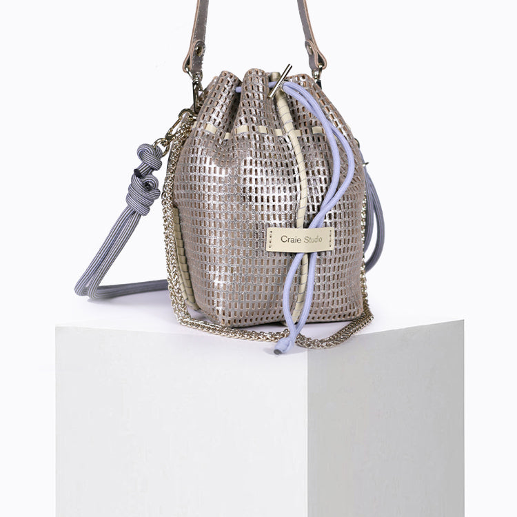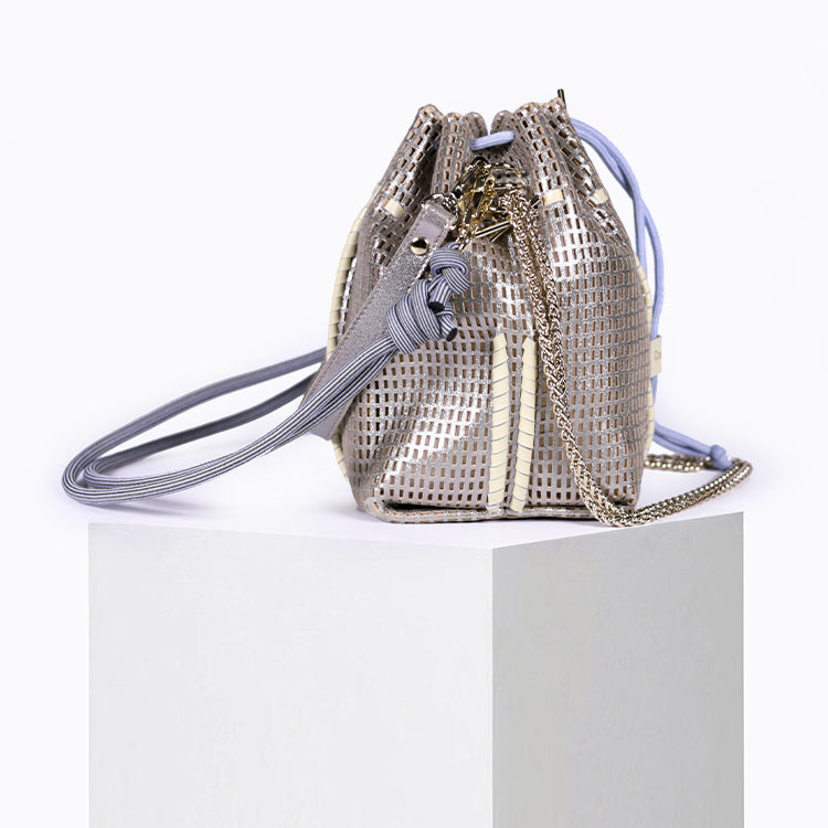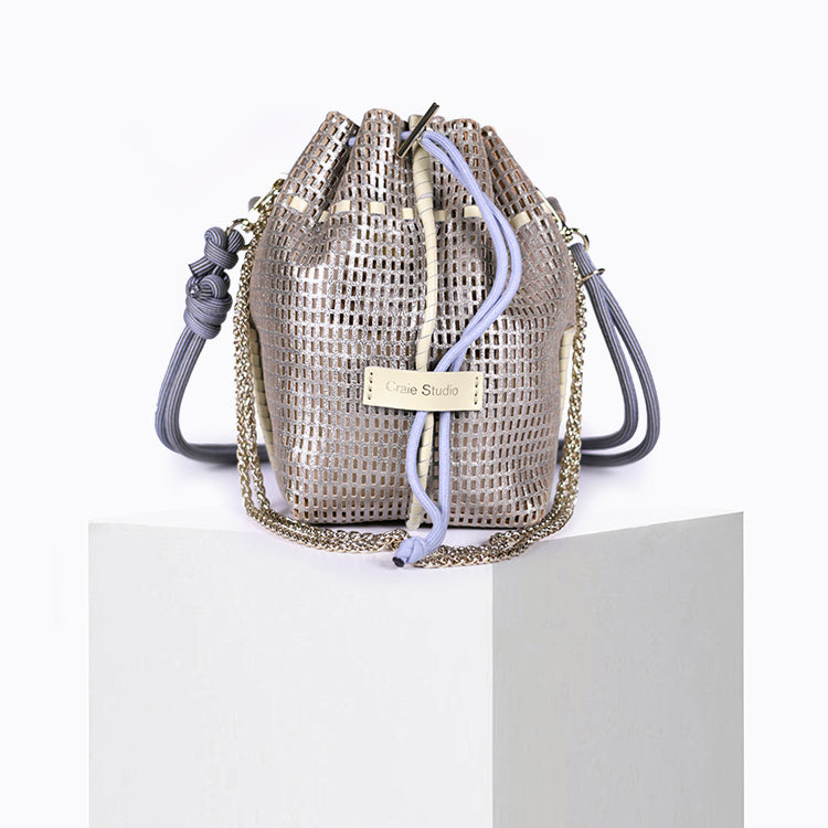 Le sac Bibi Argent est un mini sac seau au design audacieux, fabriqué à la main dans notre atelier de Casablanca.
