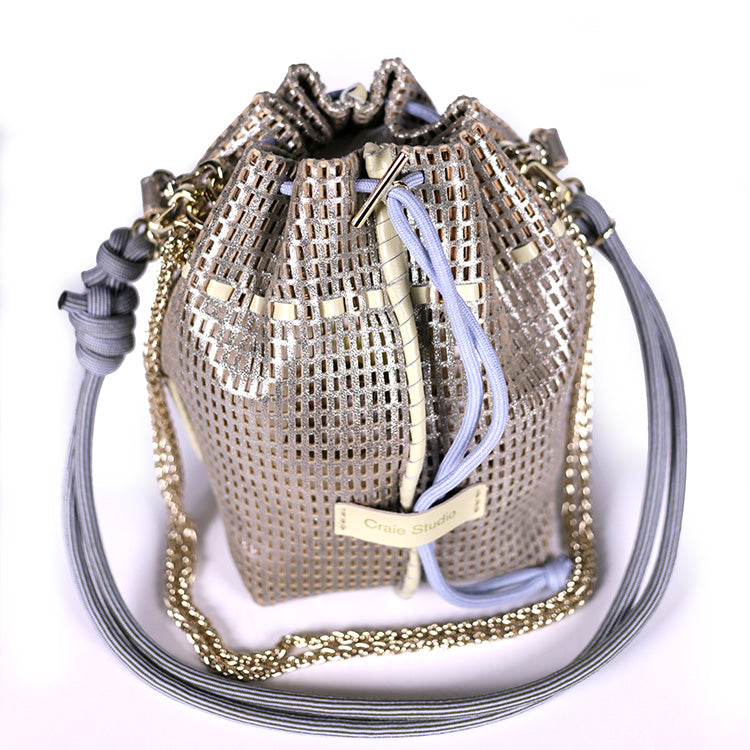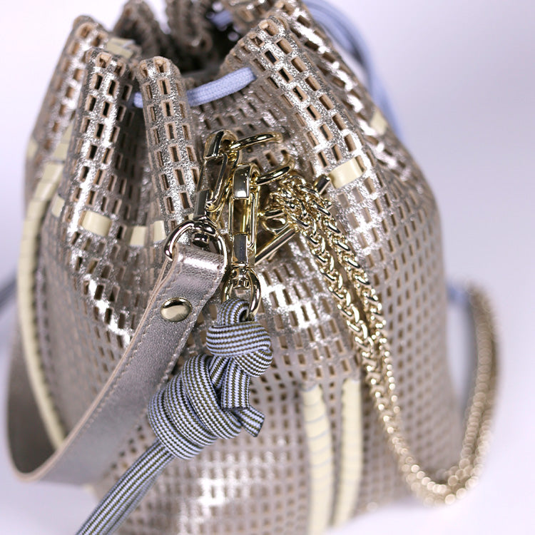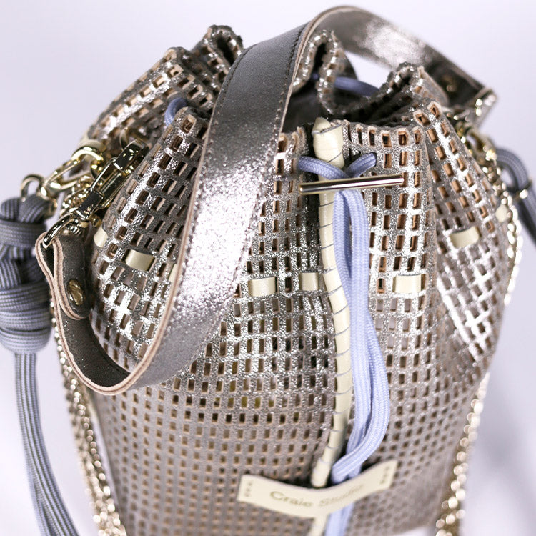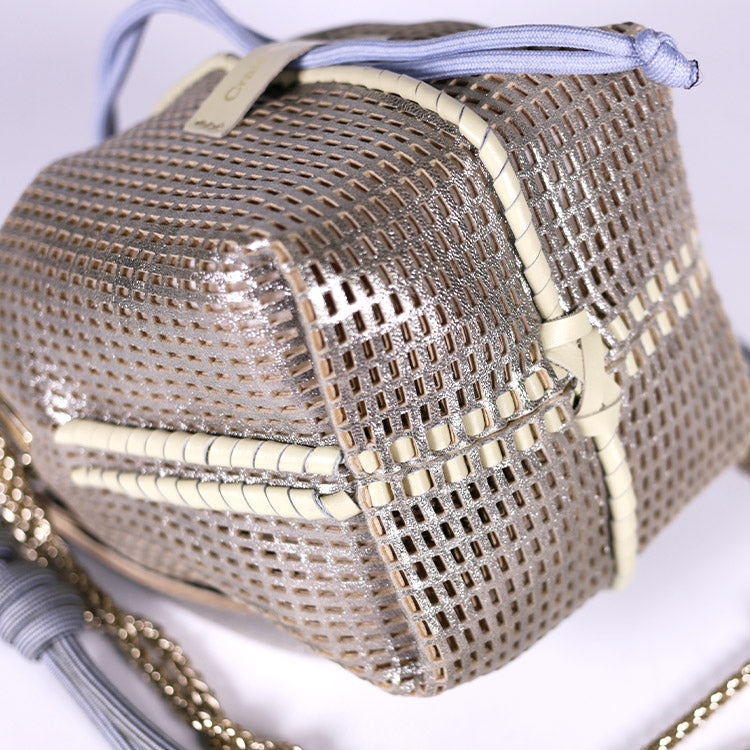Confectionné en cuir d'agneau argenté métallisé perforé, il séduit par sa structure légère, son style ajouré unique, et son allure urbaine qui en fait un accessoire mode incontournable.