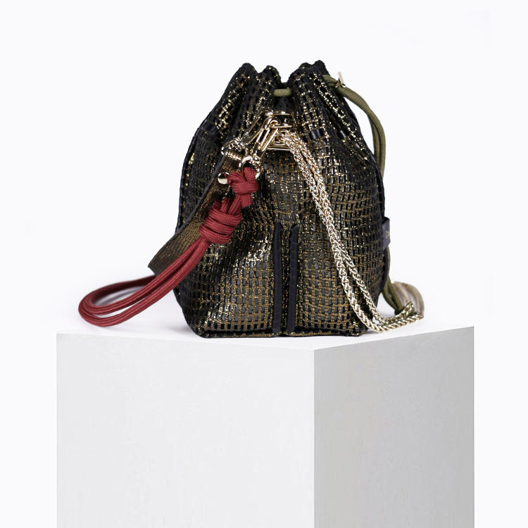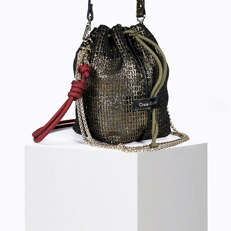 Le sac Bibi Dimaond Bronze est un mini sac seau au design audacieux, fabriqué à la main dans notre atelier de Casablanca.