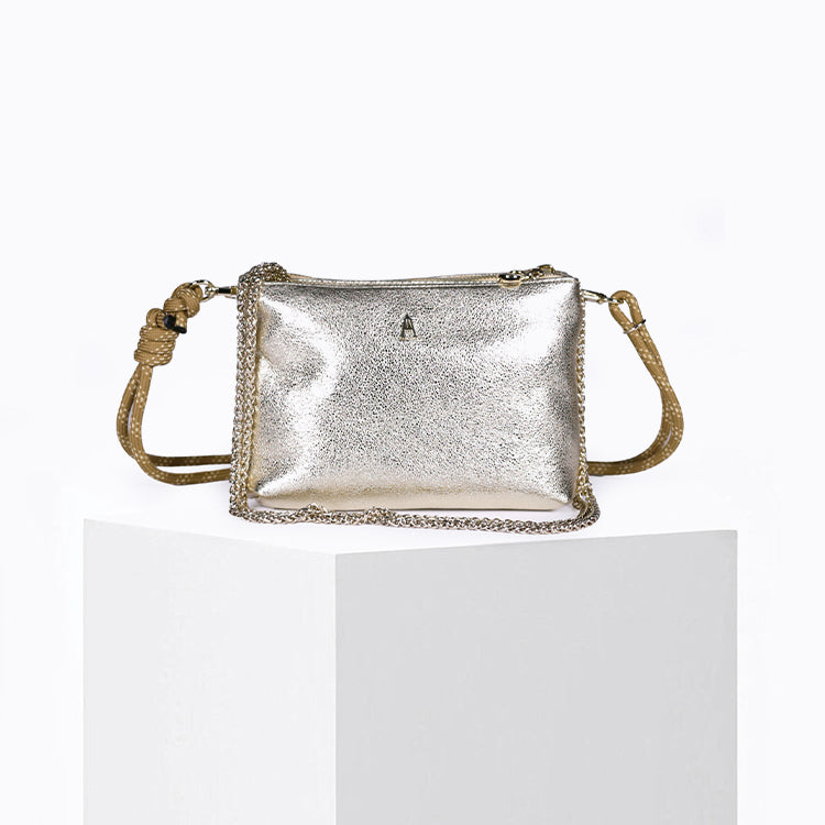 Un sac en cuir métallisé qui conjugue fonctionnalité, modularité et élégance, signature de l’univers Craie Studio.