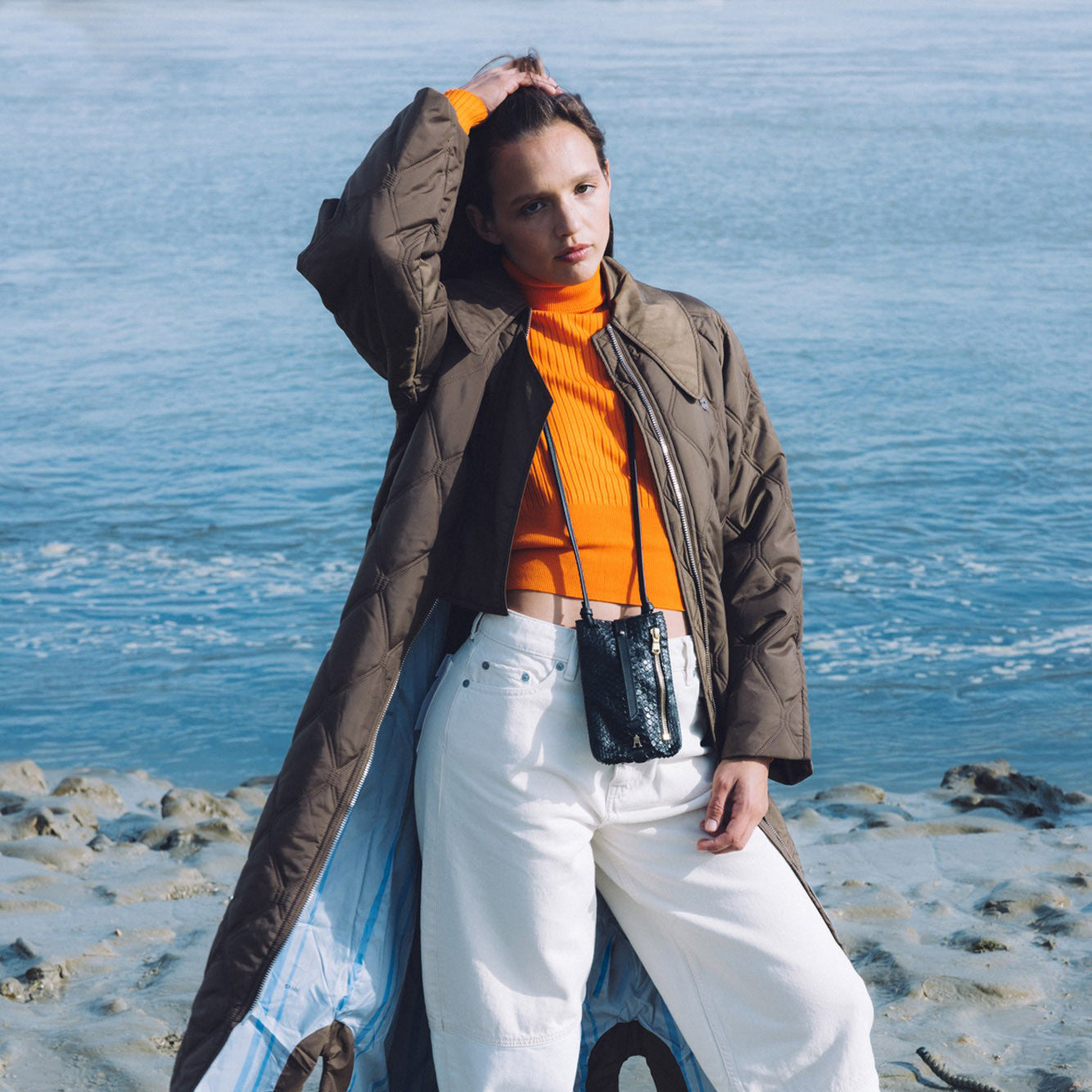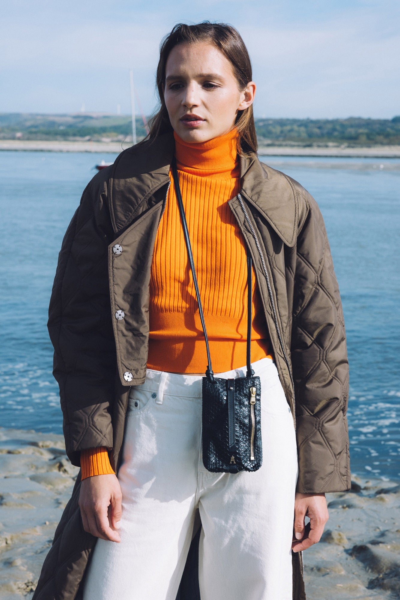 Se trata de una piel excepcional con escamas naturales finamente cortadas y muy resistentes de la que se corta la solapa del bolso. Proviene de una crianza sostenible en Vietnam y curtida en Italia. Cada bolso es único. La parte trasera del modelo es de piel de vacuno lisa de color negro que le aporta sujeción.