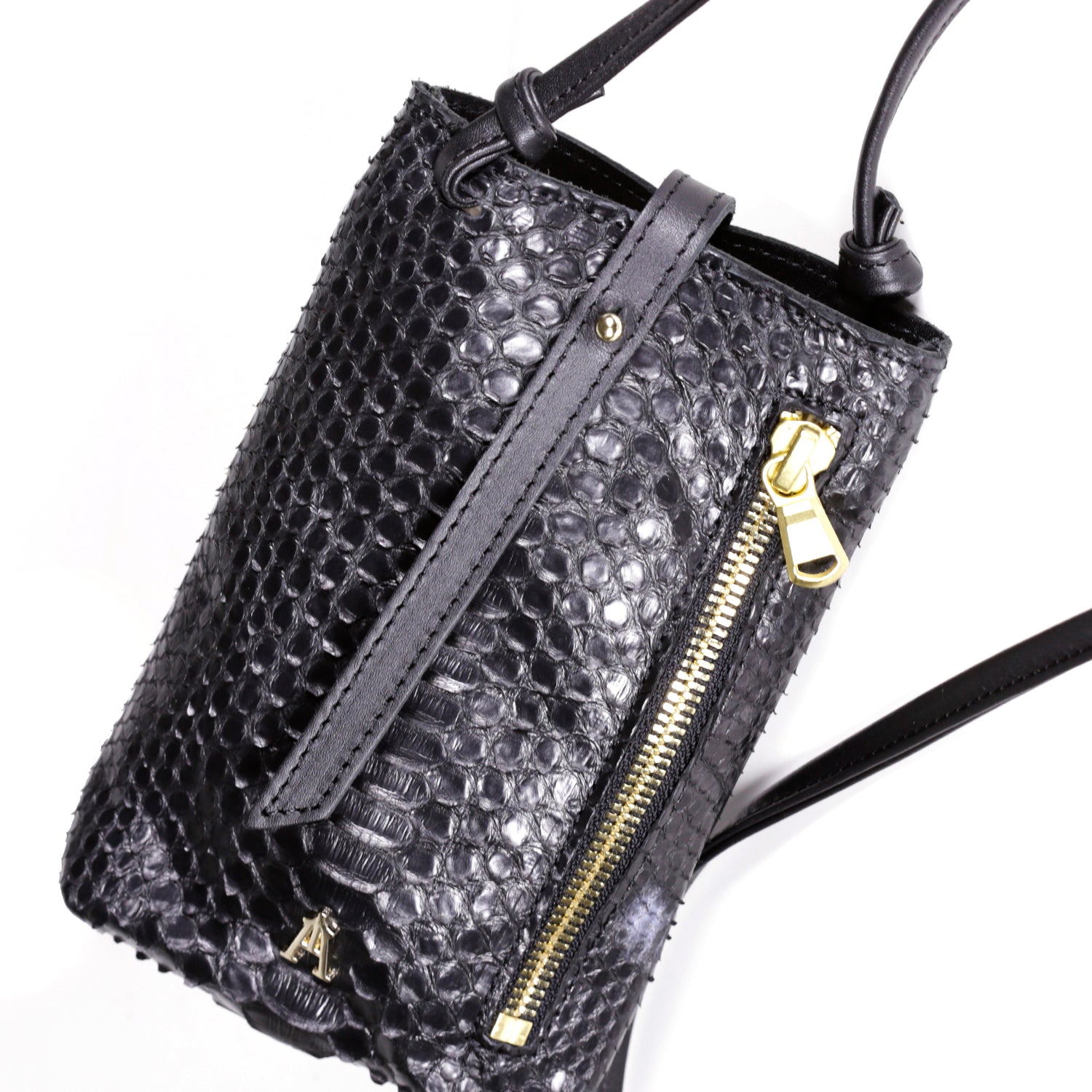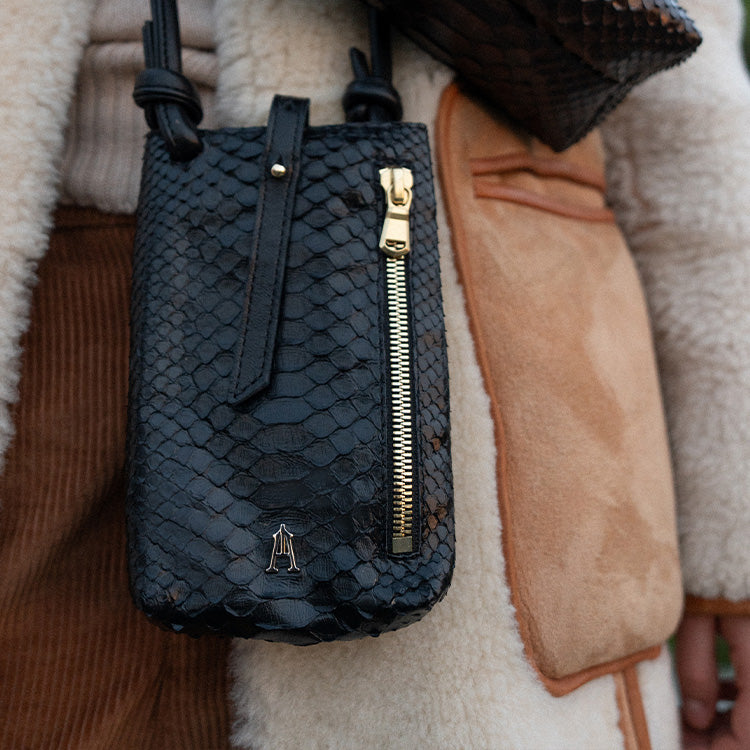 El Grigri es un estuche de auténtica piel de pitón negra para llevar el teléfono móvil como bolso pequeño, ideal para guardar lo esencial.