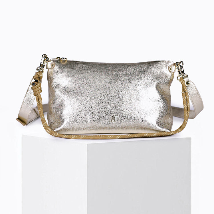 Un sac en cuir métallisé qui allie confort, modularité et élégance.