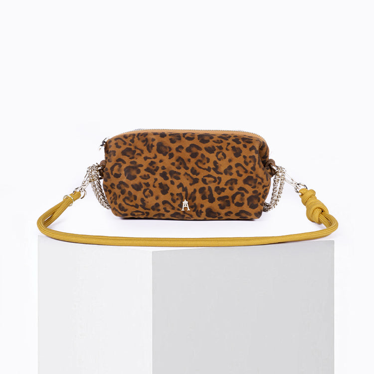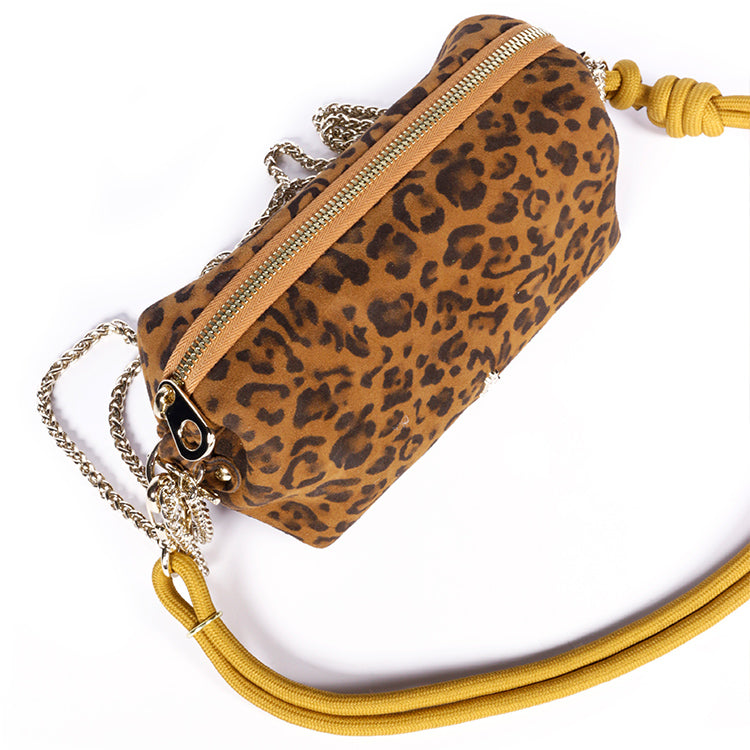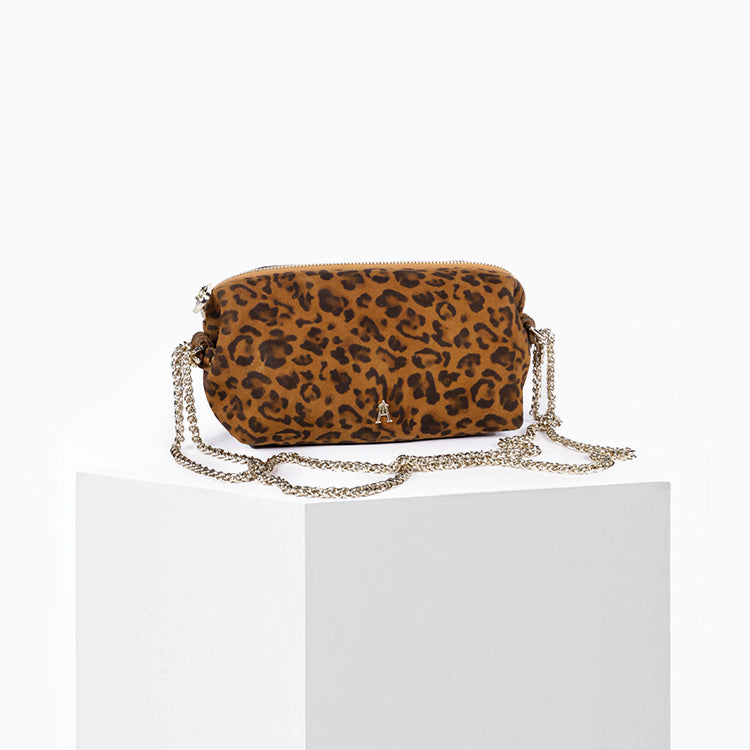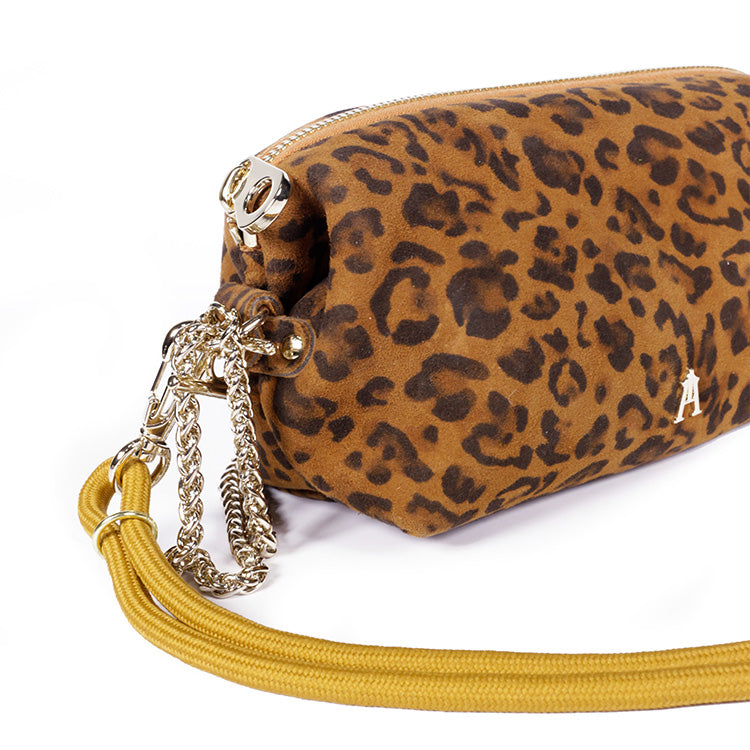 Confectionnée en cuir de chèvre velours Tan imprimé d’un motif léopard, cette pochette allie caractère et élégance. Sa texture souple et légère, doublée de coton bio, en fait un accessoire aussi pratique que chic.