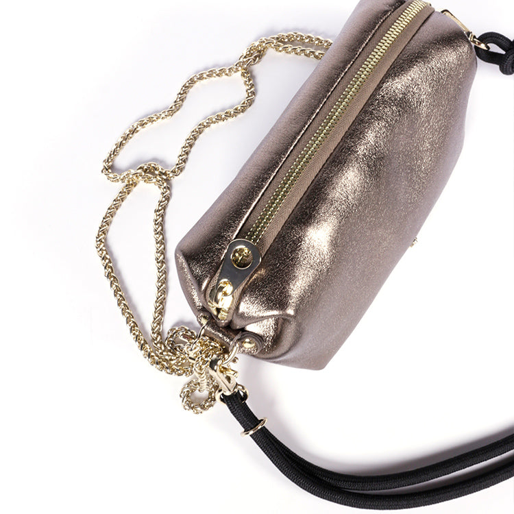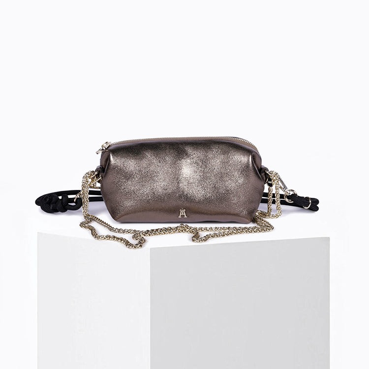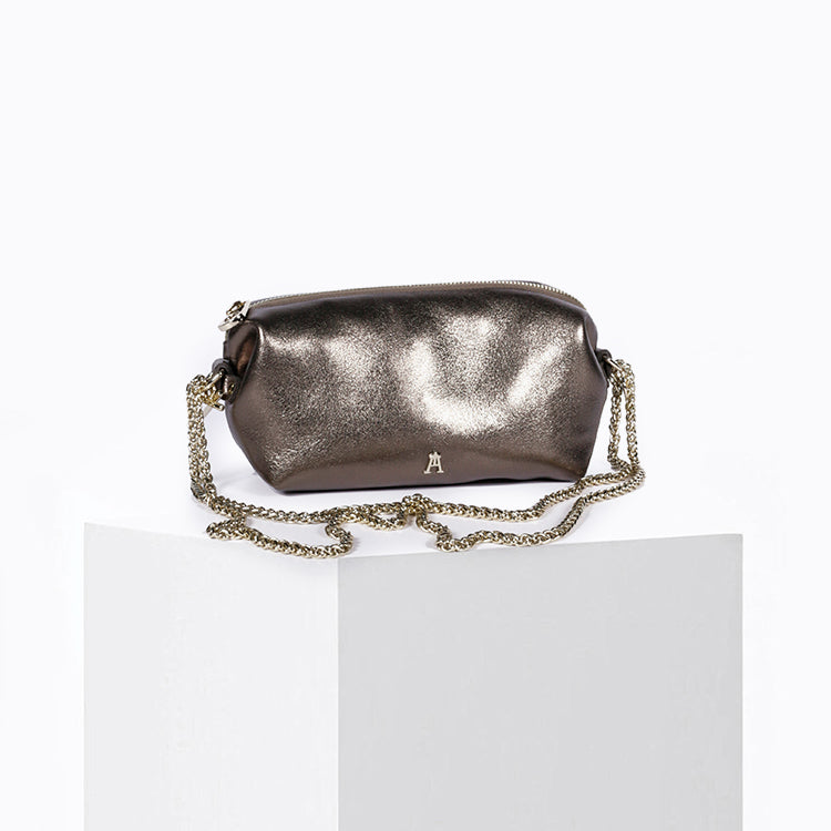 Réalisée en cuir d'agneau métallisé taupe, la Pochette Nuage Lunar illumine vos looks avec élégance. Sa texture souple, doublée en coton bio, offre à la fois légèreté et confort pour un usage au quotidien ou en soirée.