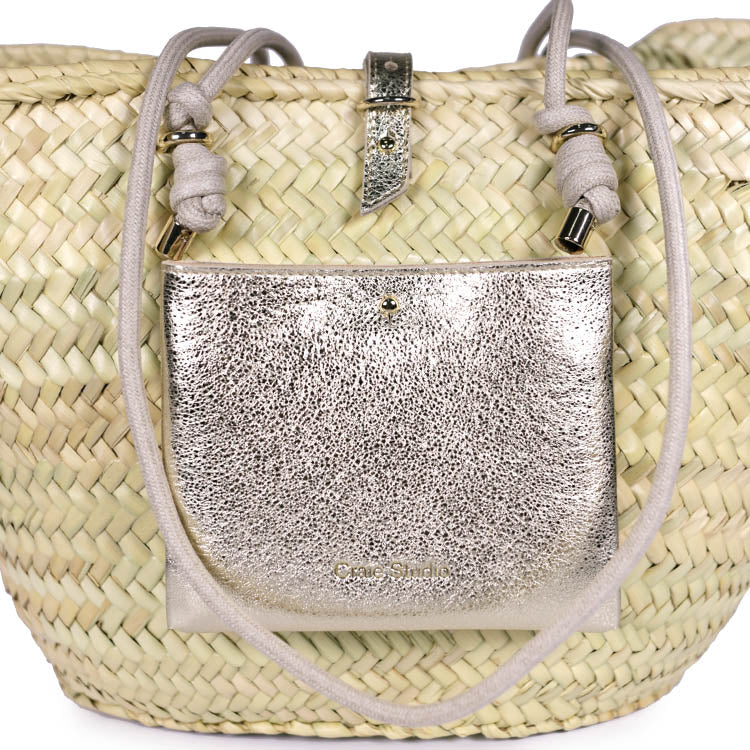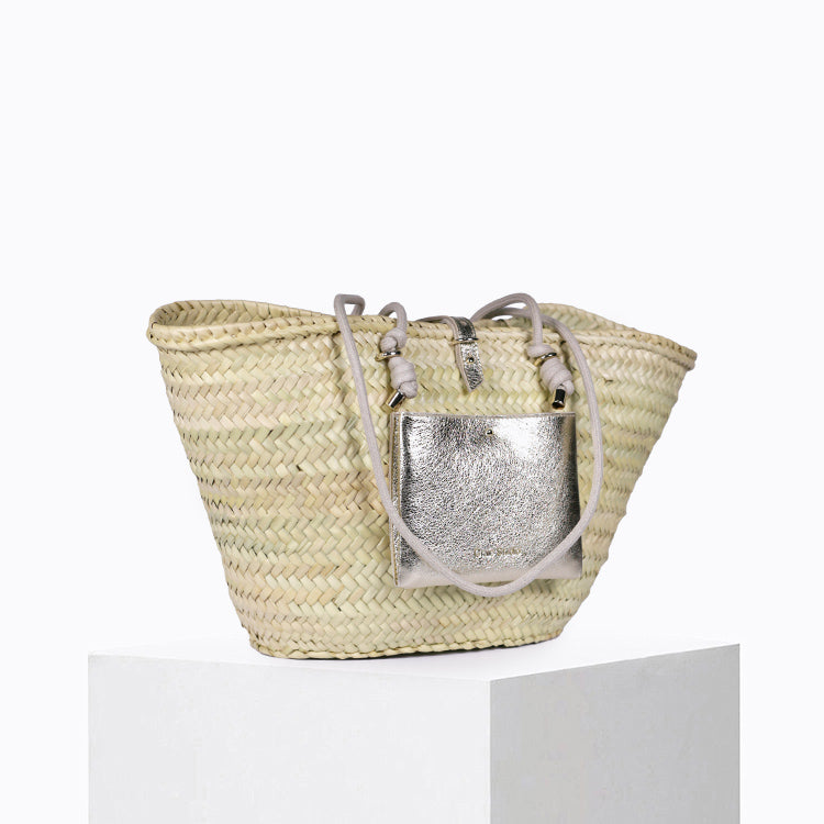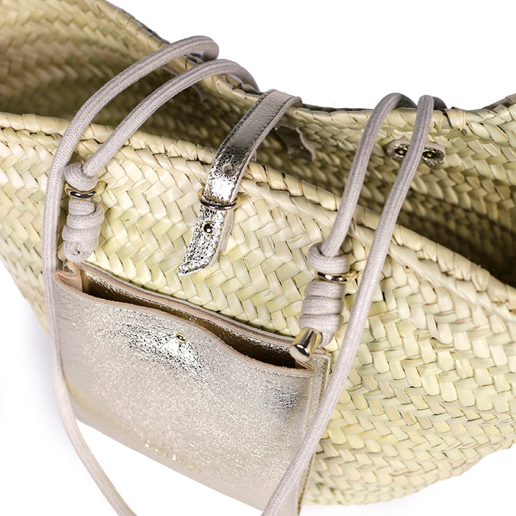 Ce modèle associe le doum naturel traditionnel au cuir d’agneau métallisé or champagne, au fini lumineux et subtil, entièrement doublé cuir. Les anses en corde d’escalade en lin viennent adoucir l’ensemble et apportent une note naturelle et élégante, en contraste avec l’éclat du cuir métallisé.