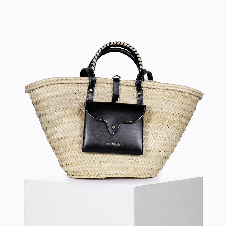 À la fois élégant et pratique, ce panier est doté d’une poche extérieure en cuir de veau Noir, soulignée de surpiqûres contrastées beiges, idéale pour garder vos essentiels à portée de main. Son format généreux en fait le compagnon parfait des journées ensoleillées, aussi bien en ville qu’à la plage.
