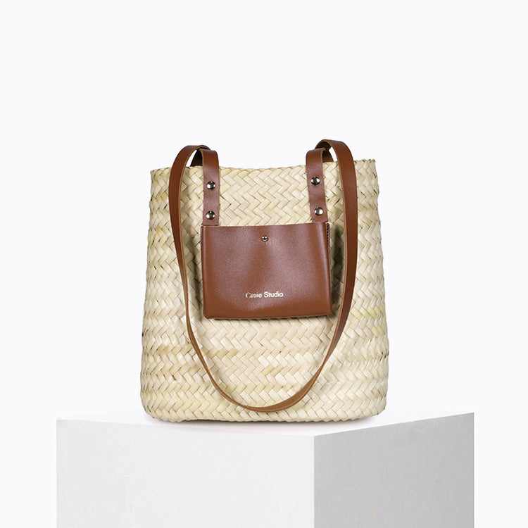 Découvrez le panier Prisme Tan, nouveau-né de la collection. Il séduit par son mélange harmonieux de doum naturel et de cuir de vachette camel, pour un panier en paille à la fois graphique, léger et contemporain.