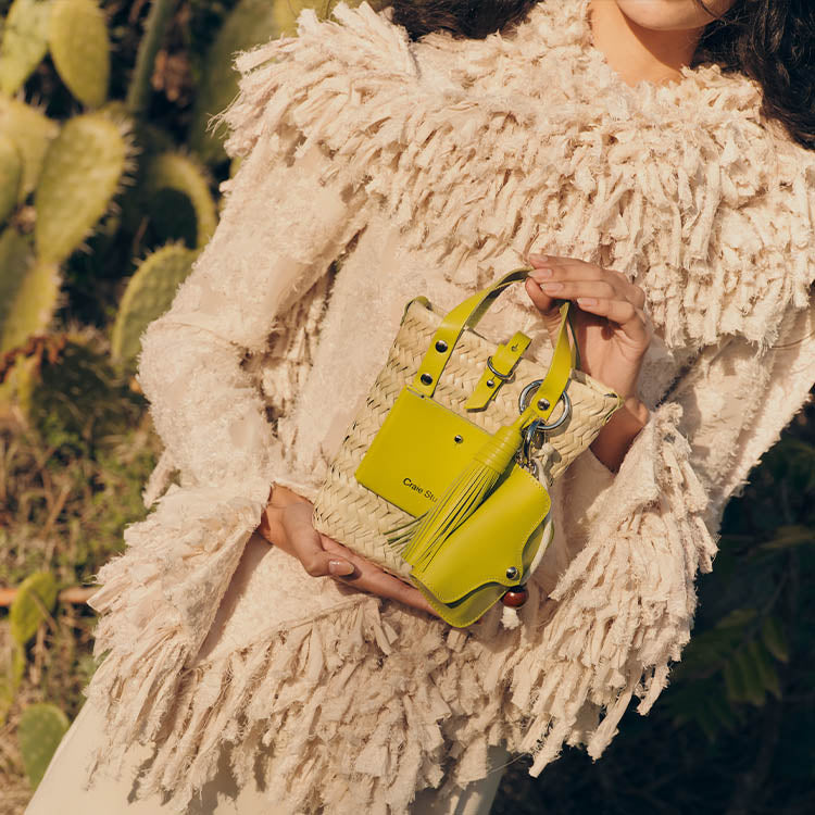 Original et plein de fraîcheur, son anneau est décoré d’un cordon d’escalade High Poussin, agrémenté d’une perle en bois et d’un palmier en cuir air estampillé Craie Studio, signature ludique et identitaire.