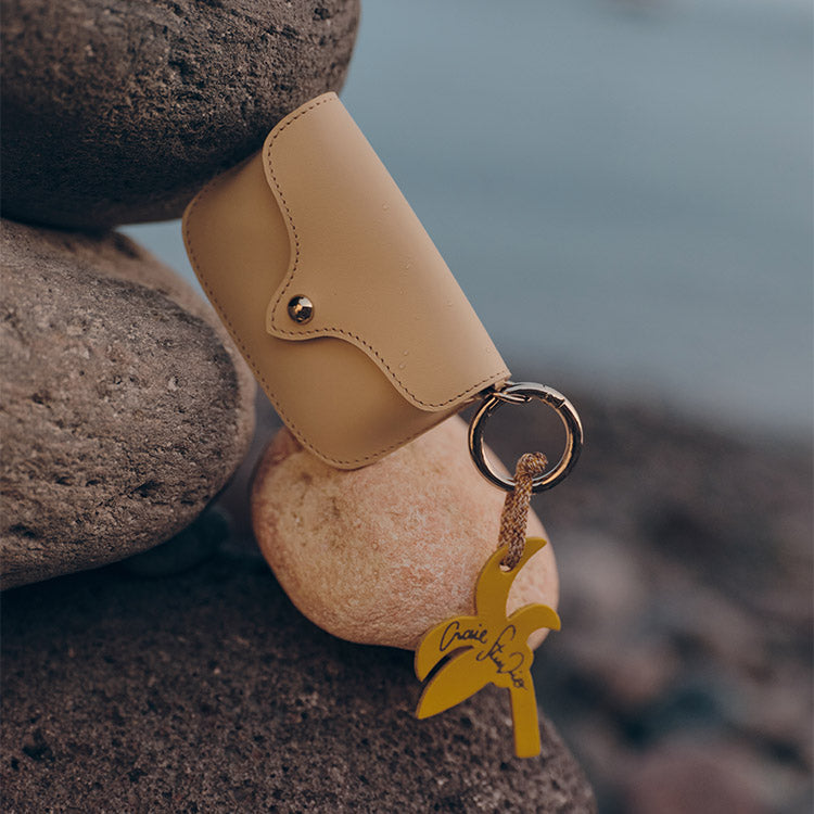 Original et plein de fraîcheur, son anneau est décoré d’un cordon d’escalade chiné jaune, agrémenté d’une perle en bois et d’un palmier en cuir jaune estampillé Craie Studio, signature ludique et identitaire.