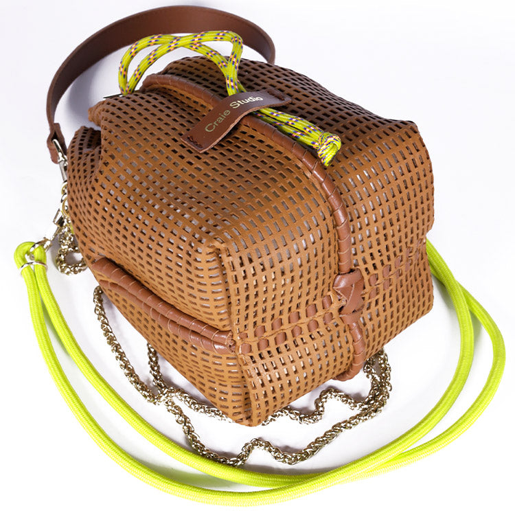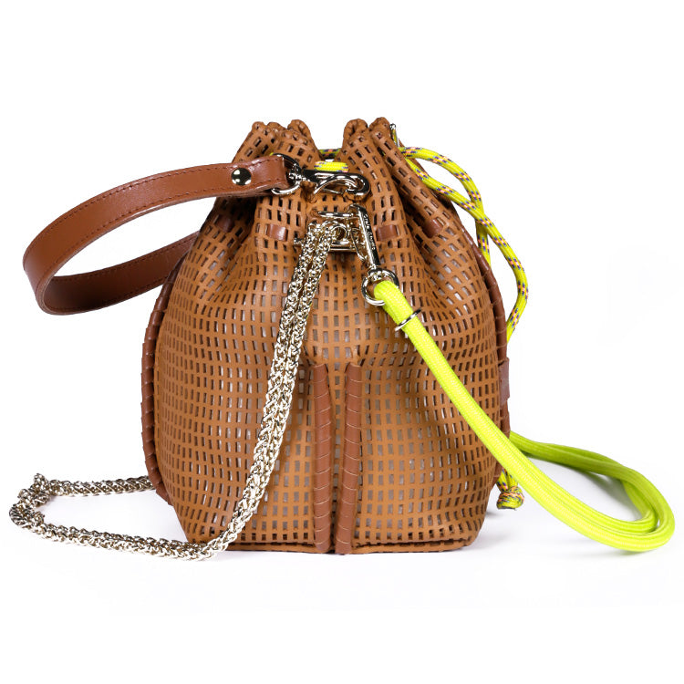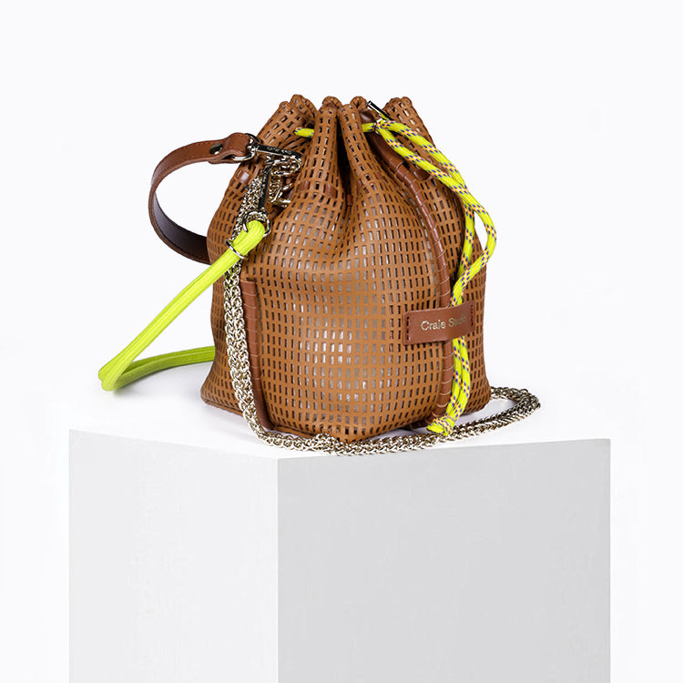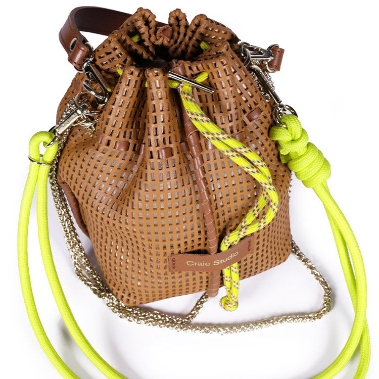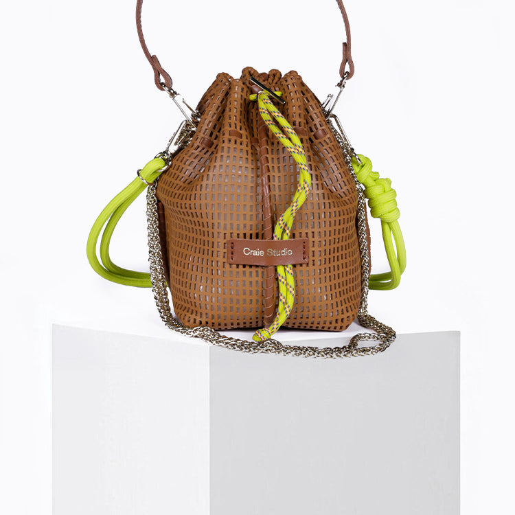 Un mini sac seau en cuir perforé qui allie artisanat, légèreté et modularité, signature de l’univers Craie Studio.