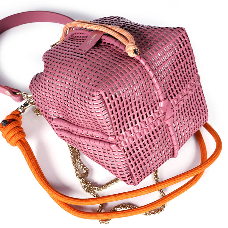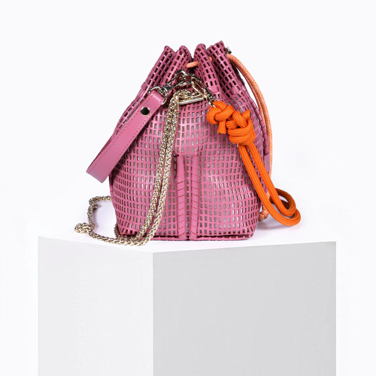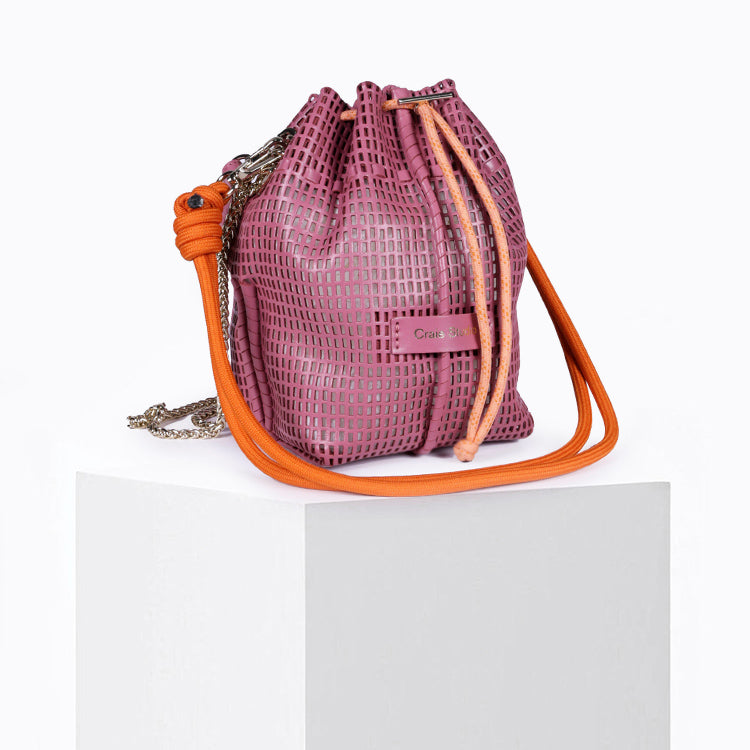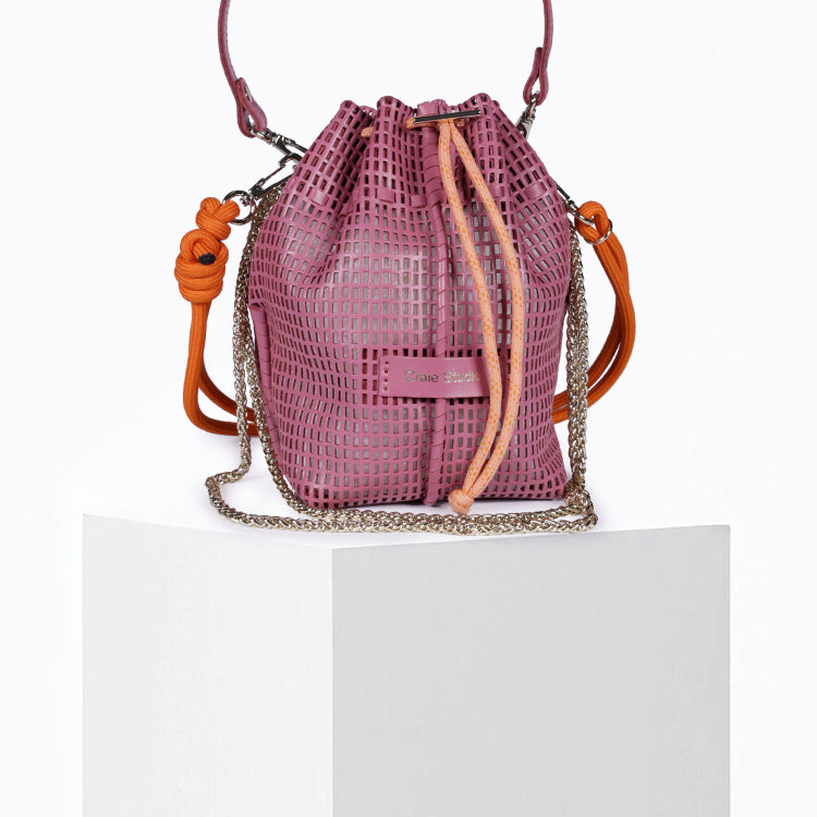 Un mini sac seau en cuir perforé qui allie artisanat, légèreté et modularité, signature de l’univers Craie Studio.