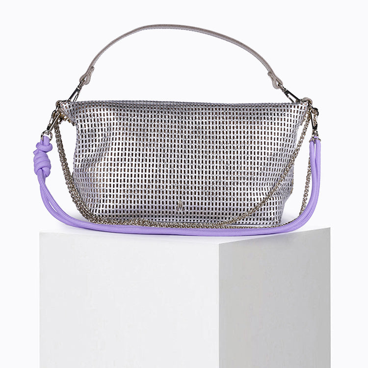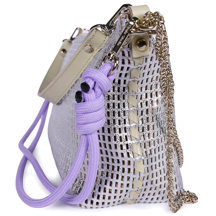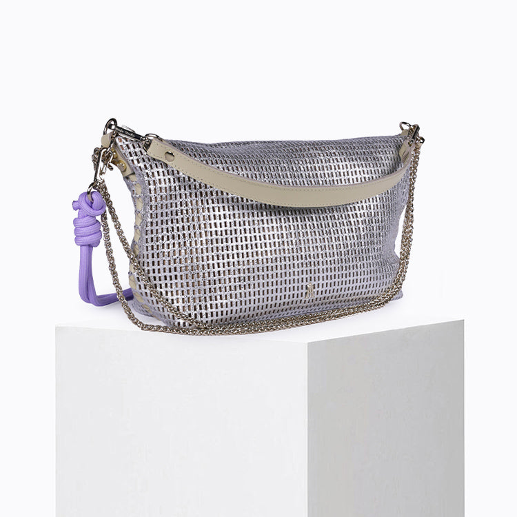 Pensé pour s’adapter à toutes vos envies, le sac Coco Argent est livré avec deux bandoulières amovibles. Il se porte avec une chaîne dorée pour une allure sophistiquée, ou avec une corde d’escalade violet Lila pour une touche plus décontractée et contemporaine.