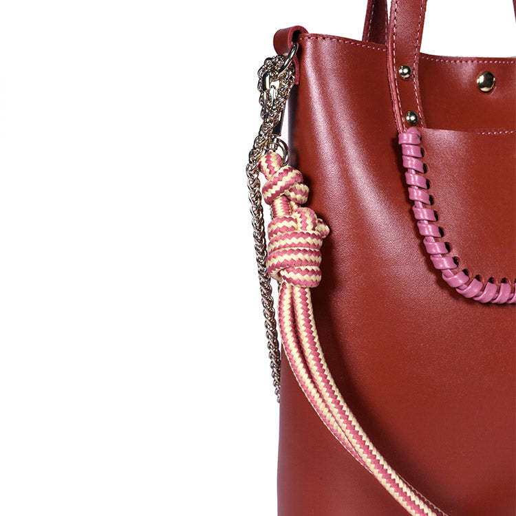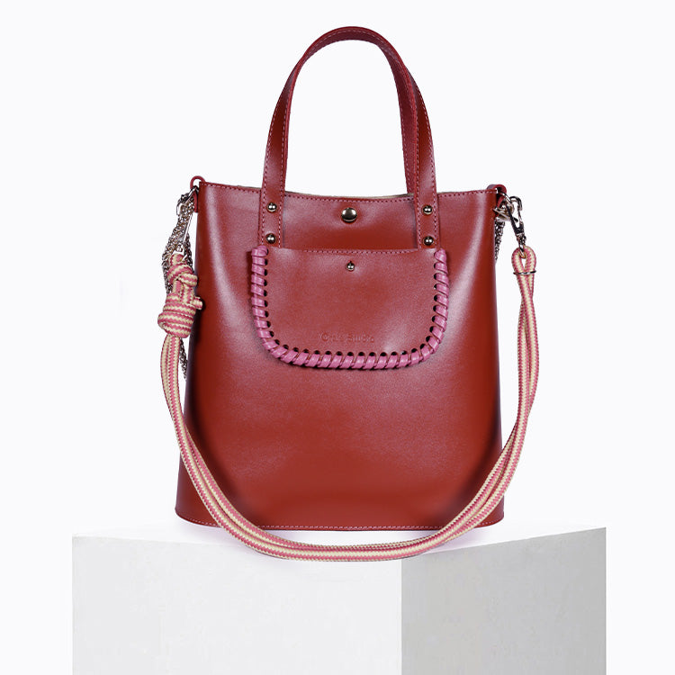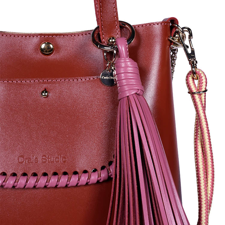 Son petit plus signature : une poche décorée d’une couture en cuir rose Blush, rehaussée d’un pompon en cuir assorti, qui apporte une note graphique et féminine à ce modèle plein de caractère.