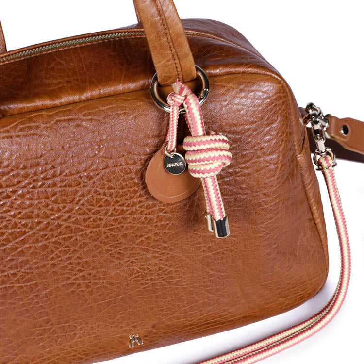 - Deux bandoulières interchangeables : cuir réglable et corde d’escalade