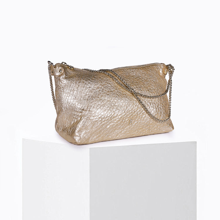 Il est réalisé en cuir d'agneau bubble beige naturellement bullé, puis irisé en surface d'un coloris or, chaque sac est unique. Sa texture souple, doublée de coton bio, en fait un accessoire beau et pratique pour le quotidien. Avec son format généreux et sa grande souplesse, il se porte selon vos envies : à l’épaule, à la main ou en pochette oversize. Idéal du matin au soir, il mêle confort et allure.