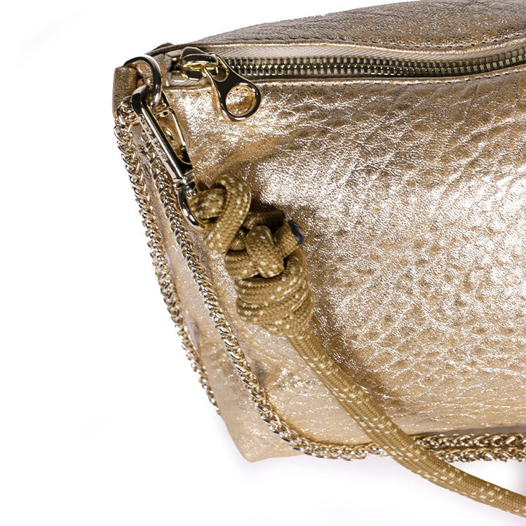 - Deux bandoulières amovibles : chaîne dorée et corde d’escalade