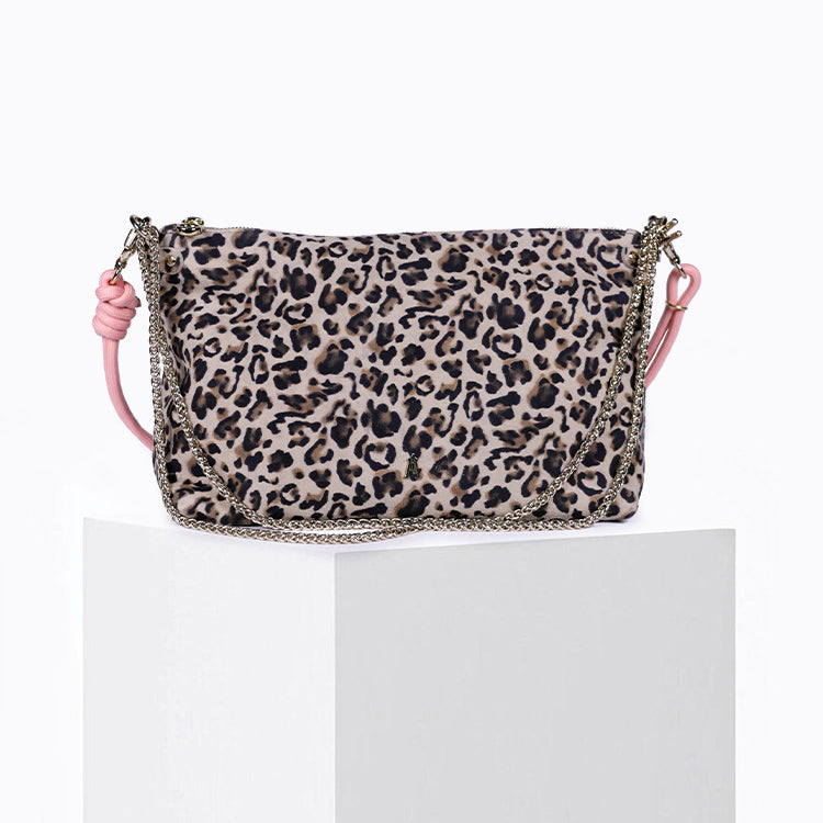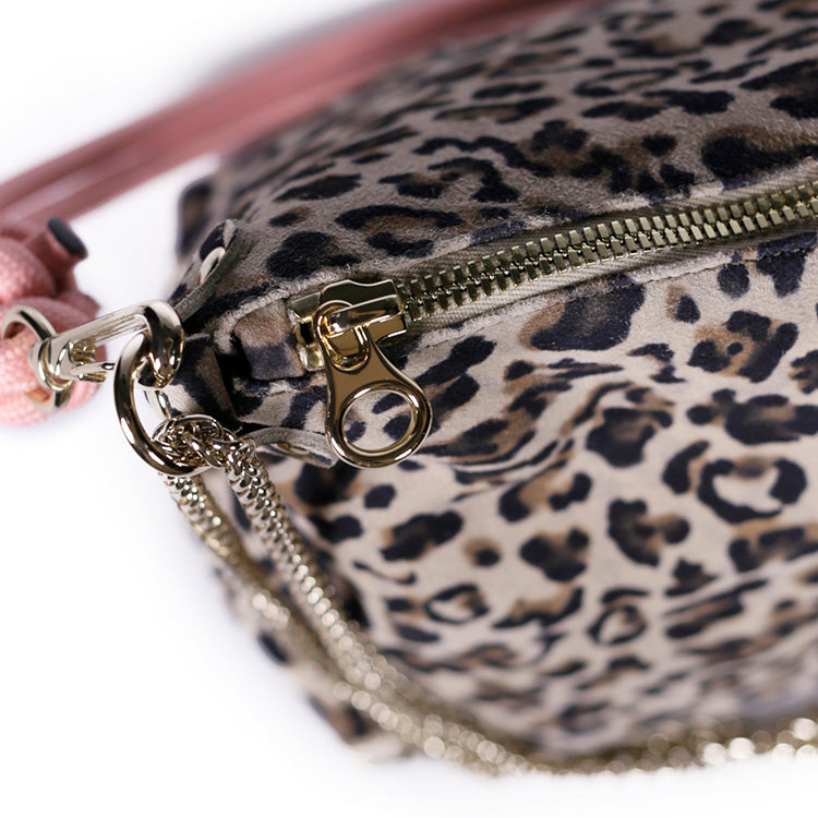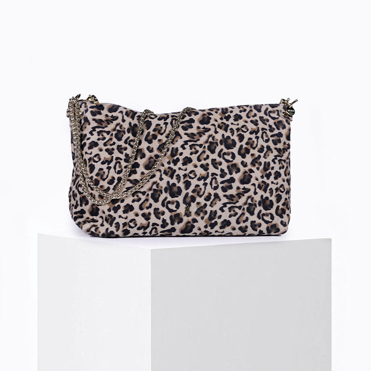 Il est réalisé en cuir de chèvre velours gris clair imprimé d’un motif léopard. Avec son format généreux et sa grande souplesse, il se porte selon vos envies : à l’épaule, à la main ou en pochette oversize. Idéal du matin au soir, il mêle confort et allure.