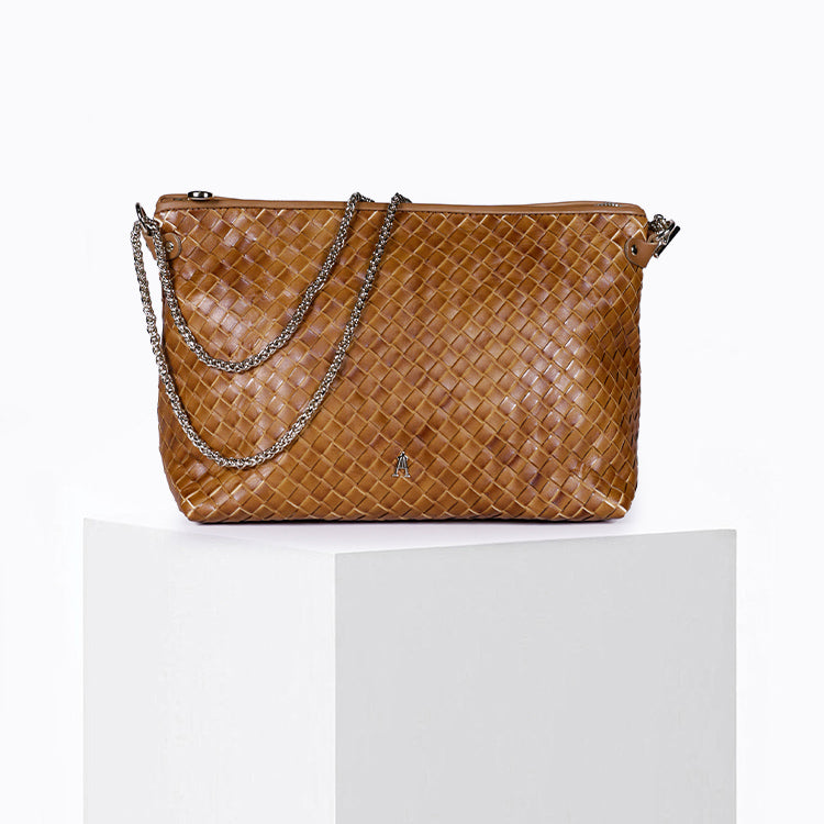 Un sac en cuir tressé patiné qui allie élégance, modularité et artisanat, signature de l’univers Craie Studio.