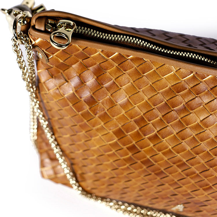 Le Mallow Tressé Patine Caramel est une version précieuse et raffinée de notre sac iconique. Confectionné en cuir d’agneau à tannage végétal, il est entièrement tressé à la main selon la technique traditionnelle de l’intrecciato, révélant un savoir-faire artisanal d’exception.