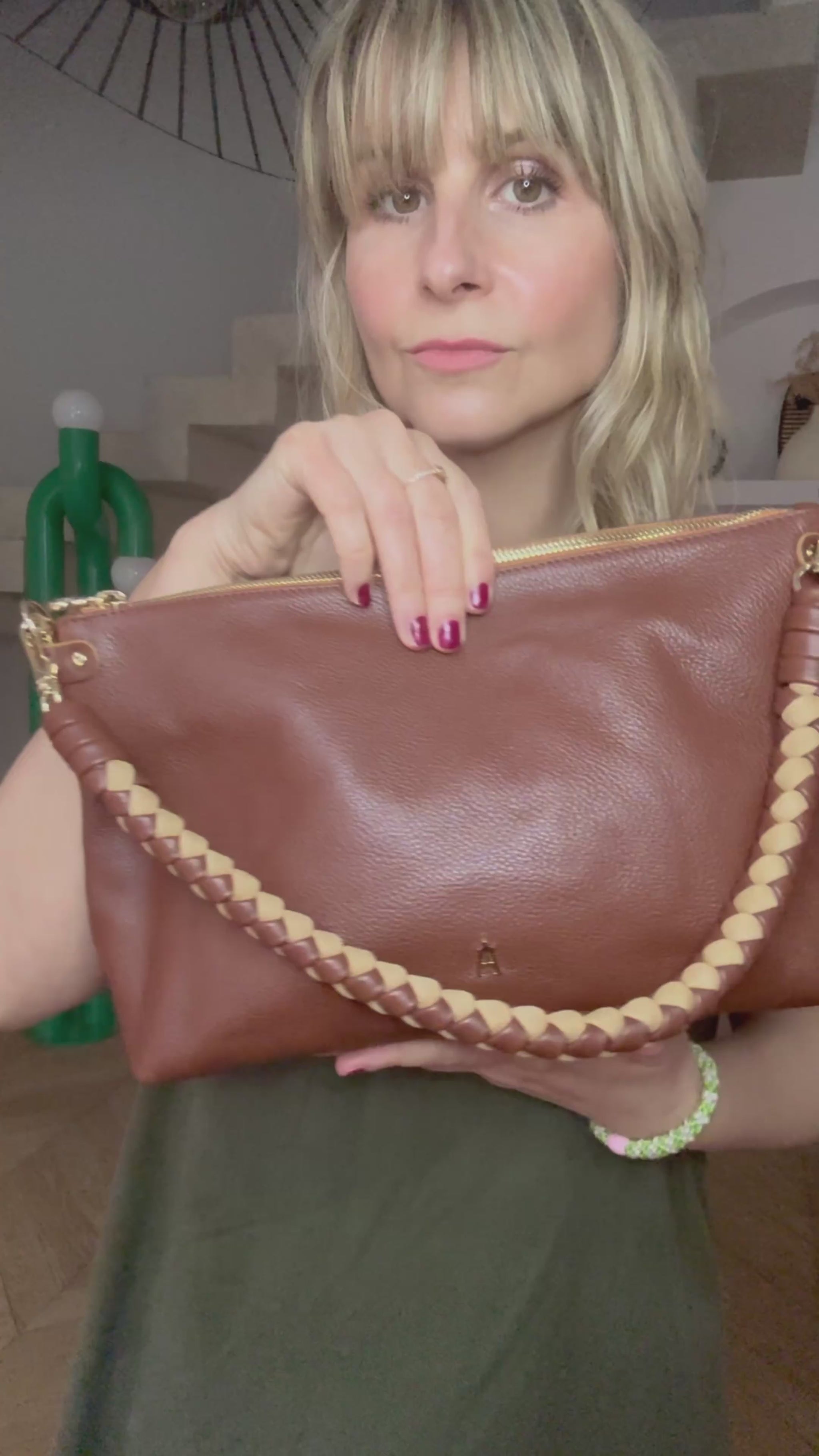 Sa silhouette souple et généreuse est sublimée par une poignée en cuir tressé bicolore, associant le cuir noir à un nubuck beige Sand, pour une finition subtile et contemporaine qui fait toute la singularité du modèle.