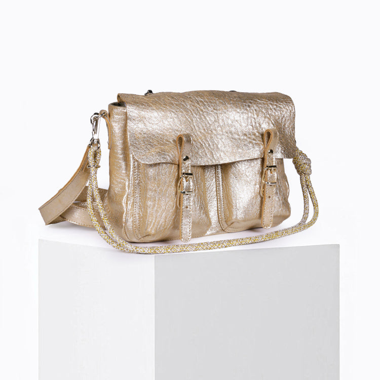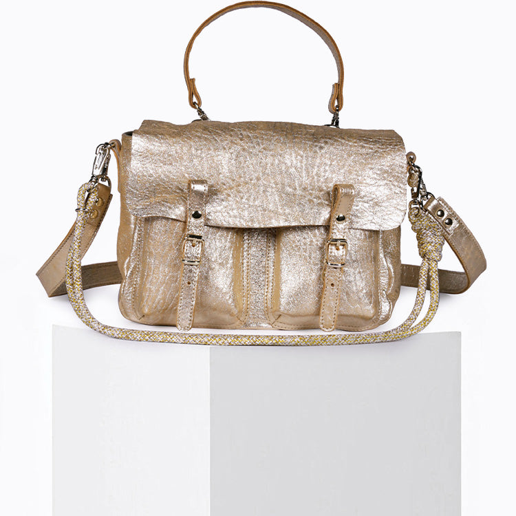Le Maths Bubble Or est le sac 2 en 1 iconique de Craie Studio, pensé pour celles et ceux qui recherchent un sac modulable, créatif et engagé. Il est confectionné en cuir d’agneau bubble camel, naturellement bullé et souple, sublimé par un fin métallisé doré clair en surface.