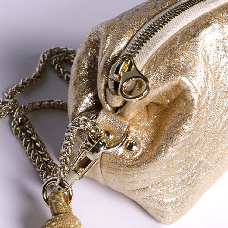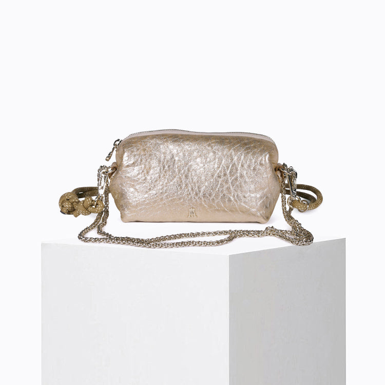 Confectionnée en cuir d'agneau bubble beige naturellement bullé, chaque sac est unique. Il est métallisé en surface d'un effet poudré doré champagne. Sa texture souple, doublée de coton bio, en fait un accessoire beau et pratique pour le quotidien.