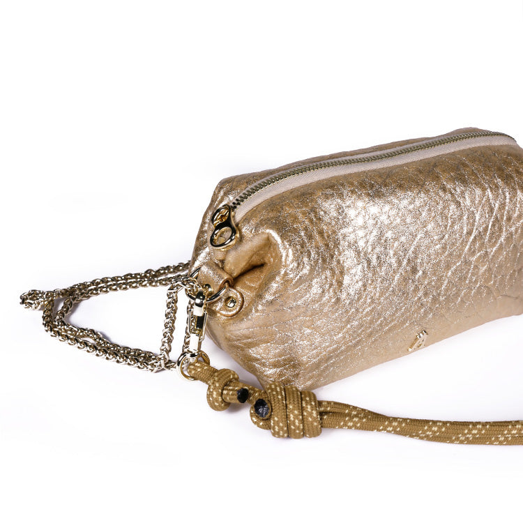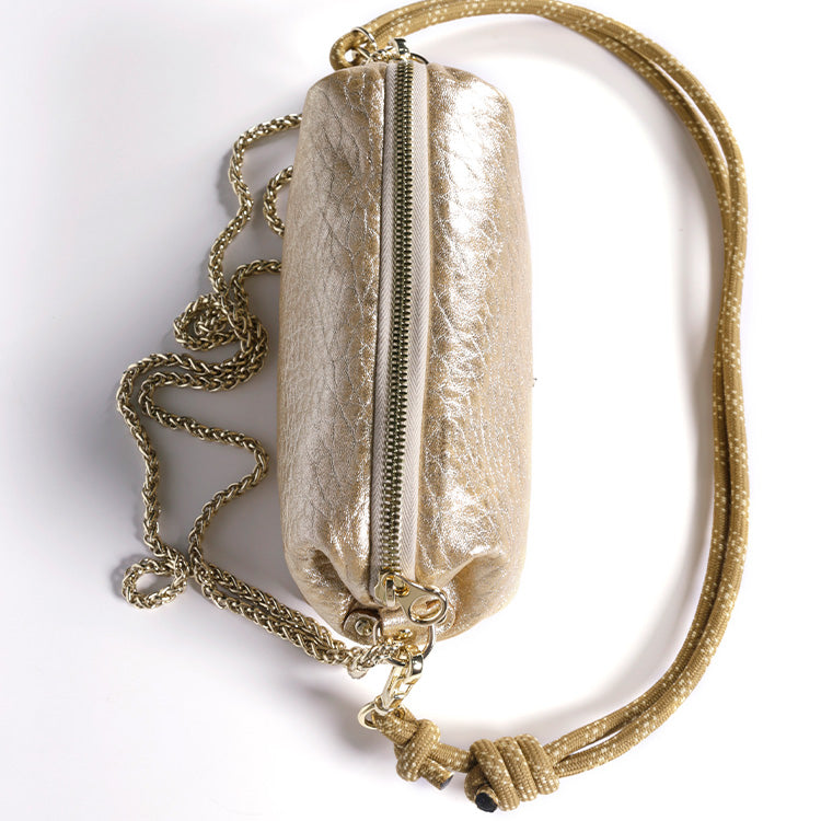 La pochette Nuage Bubble Or est un petit sac ultra modulable vendu avec 2 bandoulières.