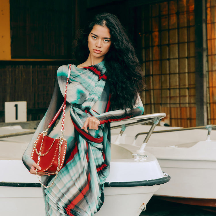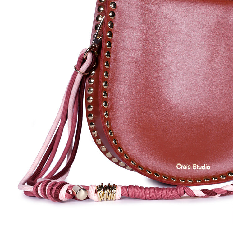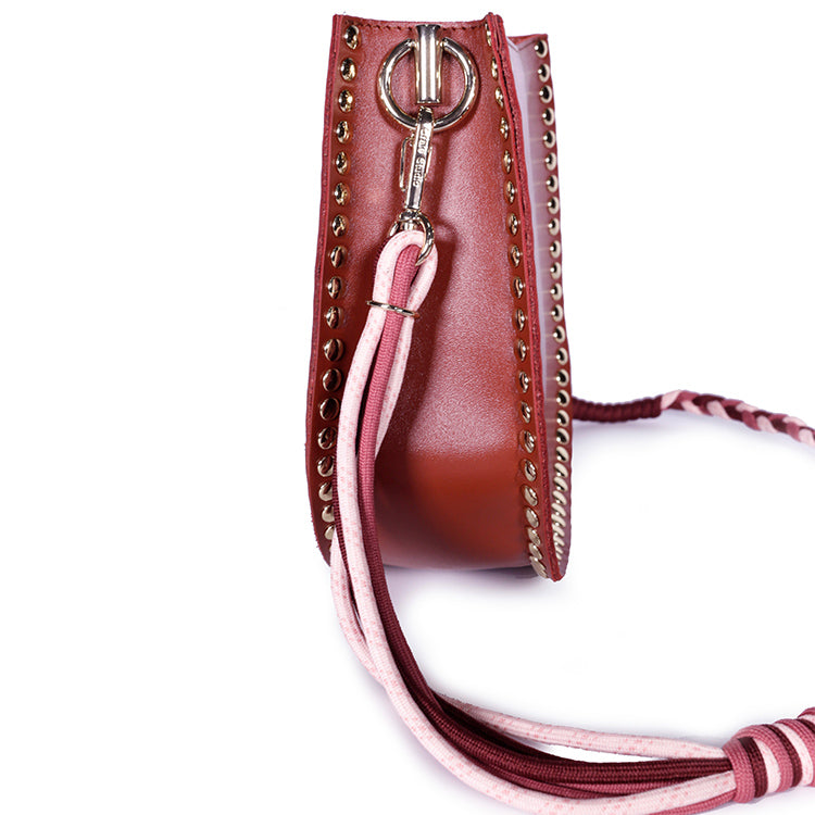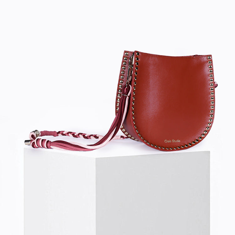 Confectionné en cuir de veau rigide bordeaux, ce sac en cuir séduit par sa silhouette épurée et son design intemporel. Il est doté d’une bandoulière originale en corde, mêlant tressage et accessoires, ajustable sur le côté grâce à un nœud coulissant. Il se porte aussi bien à l’épaule qu’en crossbody, selon vos envies.