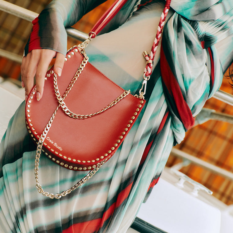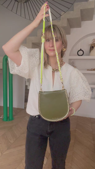 Le sac Oro Clou Terra est un petit sac bandoulière en cuir à l’allure rock et féminine. Sa forme arrondie est sublimée par une centaine de rivets décoratifs or clair, qui dessinent élégamment sa courbe et lui donnent un caractère affirmé.