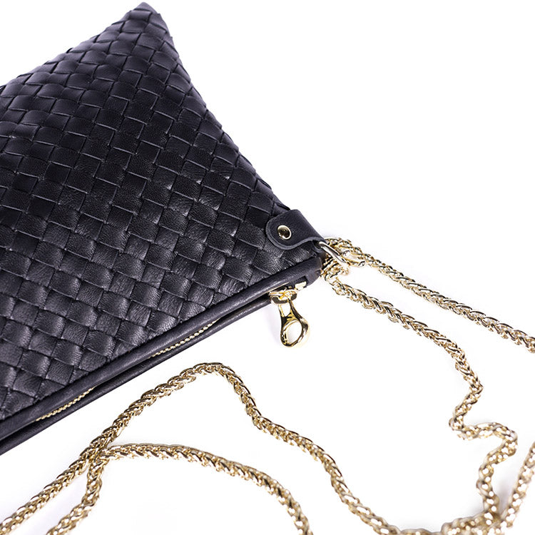 Fine, souple et élégante, cette pochette séduit par son tressage manuel, qui apporte relief, texture et caractère tout en conservant une silhouette épurée. Son format plat en fait un accessoire idéal aussi bien en journée qu’en soirée.