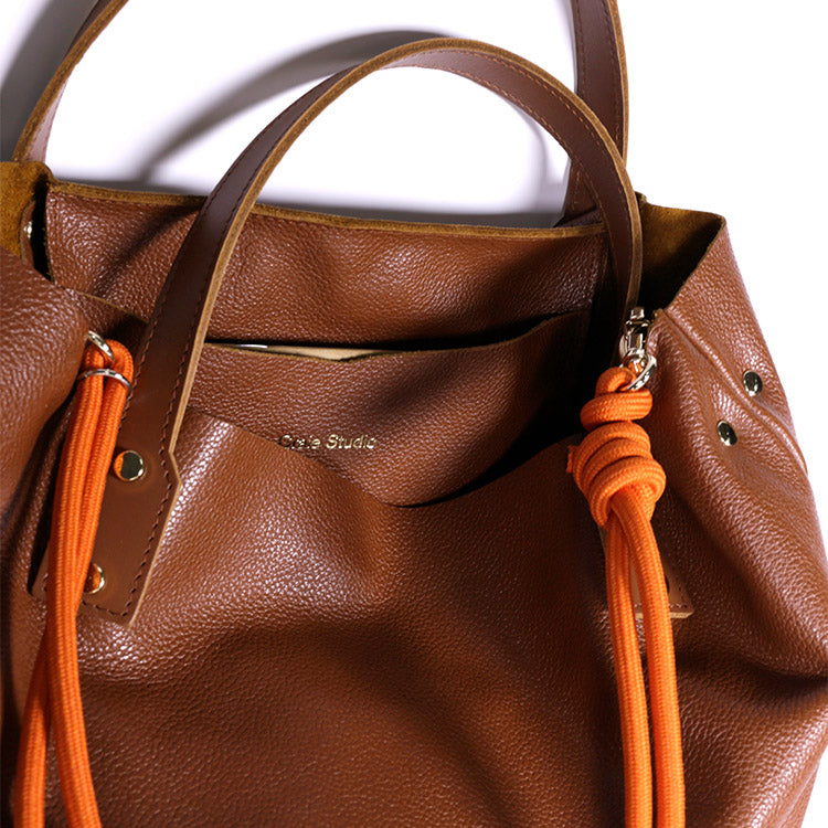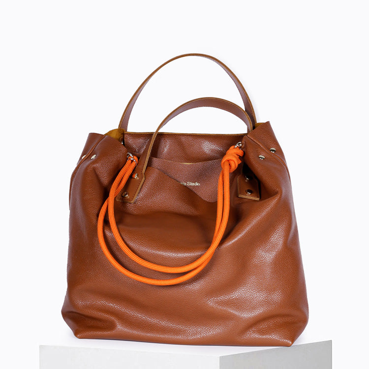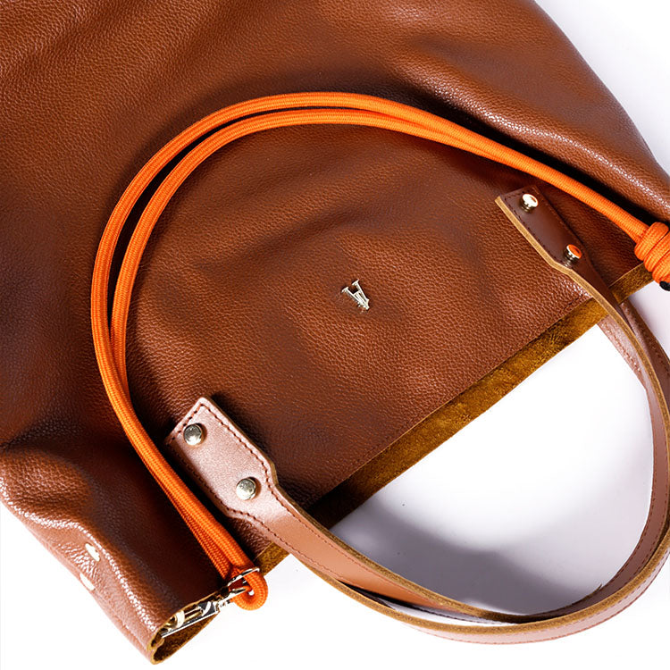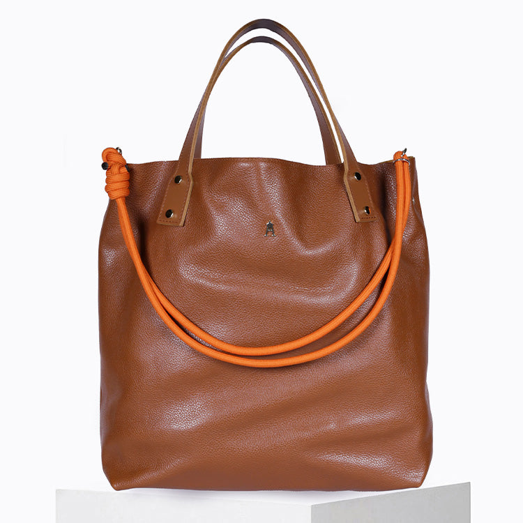 Pensé pour accompagner vos déplacements quotidiens, ce cabas en cuir offre un format généreux permettant d’y glisser votre ordinateur et tous vos essentiels de la journée. Il se porte à la main ou à l’épaule, grâce à sa bandoulière amovible en corde d’escalade Mandarine, qui apporte une touche graphique et personnalisée à votre silhouette.