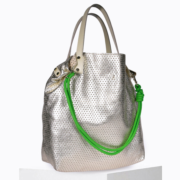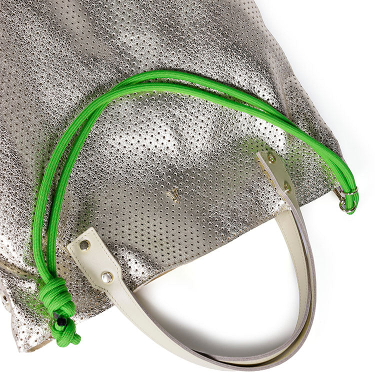 Le cabas Ruban Perfo Or se porte à la main ou à l’épaule, grâce à sa bandoulière amovible en corde d’escalade verte, qui apporte une touche graphique et personnalisée à la silhouette. Léger et fonctionnel, il séduit par son design épuré et son esprit moderne, fidèle à l’ADN Craie Studio.