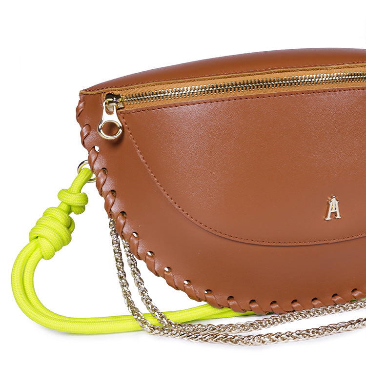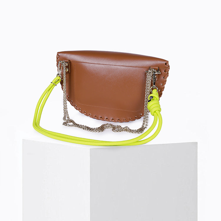 et une bandoulière en corde d’escalade réglable, coloris vert Lime, pour un style plus décontracté et contemporain.