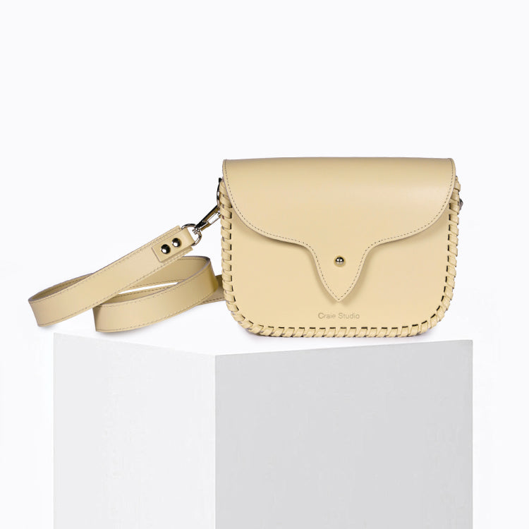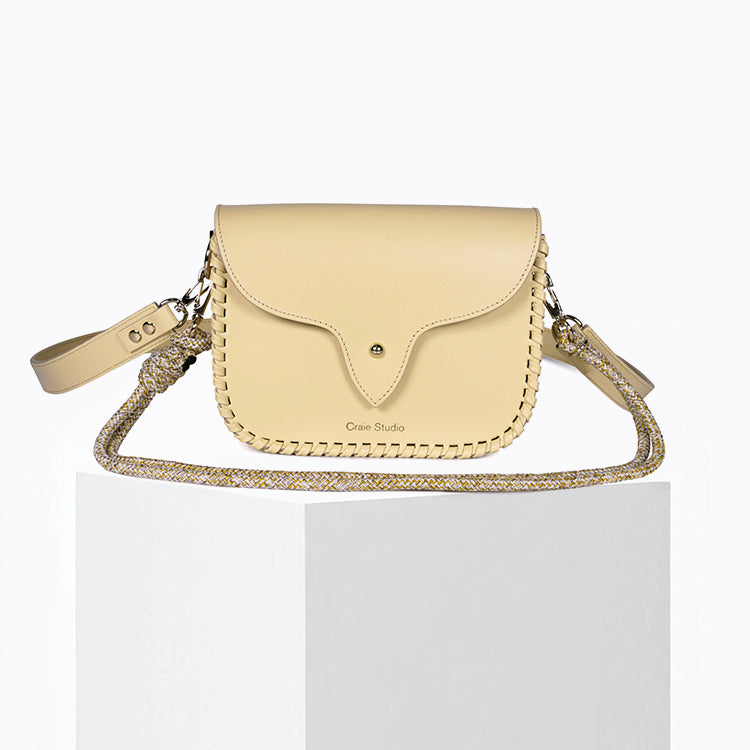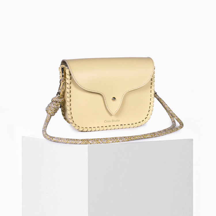 Le sac West Vanille incarne l’équilibre parfait entre structure contemporaine et esprit western. Confectionné en cuir de veau rigide jaune beurre, il séduit par sa silhouette graphique et ses coutures en cuir faites à la main, qui soulignent son caractère affirmé et intemporel.